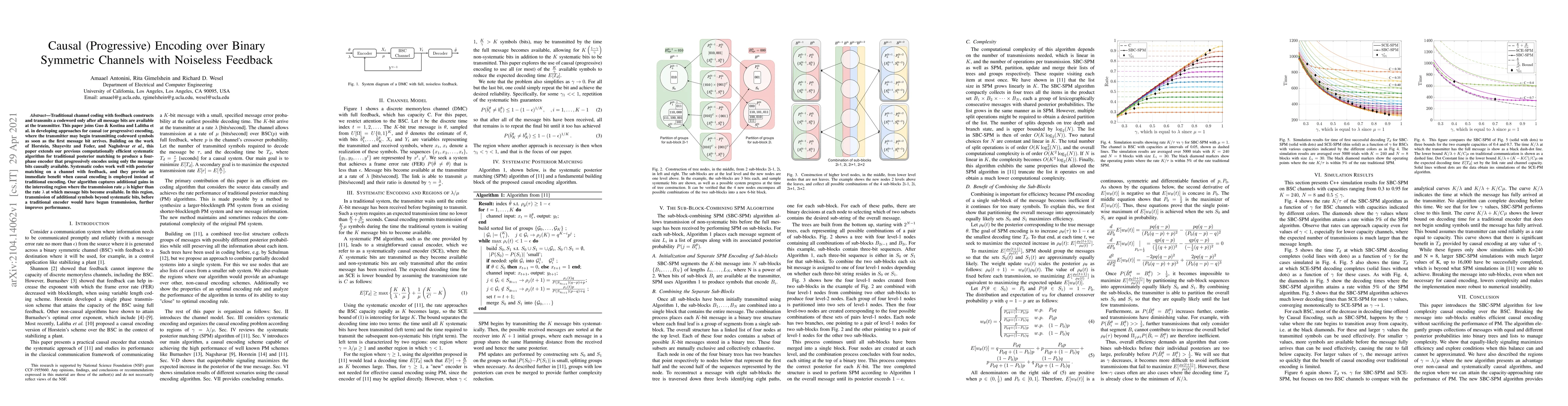 The paper develops a four-phase encoder for causal (progressive) encoding over BinarySymmetric Channels (BSC) with noiseless feedback, extending a systematic posterior matching algorithm to transmit codeword symbols as soon as the first message bit arrives.