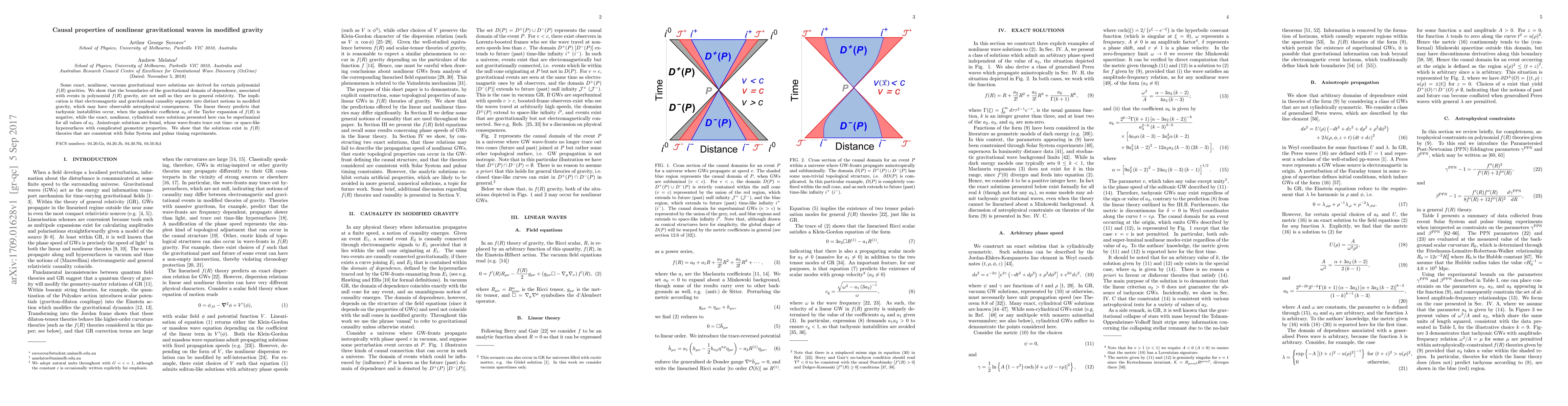Some exact, nonlinear, vacuum gravitational wave solutions are derived for certain polynomial $f(R)$ gravities. We show that the boundaries of the gravitational domain of dependence, associated with events in polynomial $f(R)$ gravity, are not null as they are in general relativity. The implication is that electromagnetic and gravitational causality separate into distinct notions in modified gravity, which may have observable astrophysical consequences. The linear theory predicts that tachyonic instabilities occur, when the quadratic coefficient $a_{2}$ of the Taylor expansion of $f(R)$ is negative, while the exact, nonlinear, cylindrical wave solutions presented here can be superluminal for all values of $a_{2}$. Anisotropic solutions are found, whose wave-fronts trace out time- or space-like hypersurfaces with complicated geometric properties. We show that the solutions exist in $f(R)$ theories that are consistent with Solar System and pulsar timing experiments.