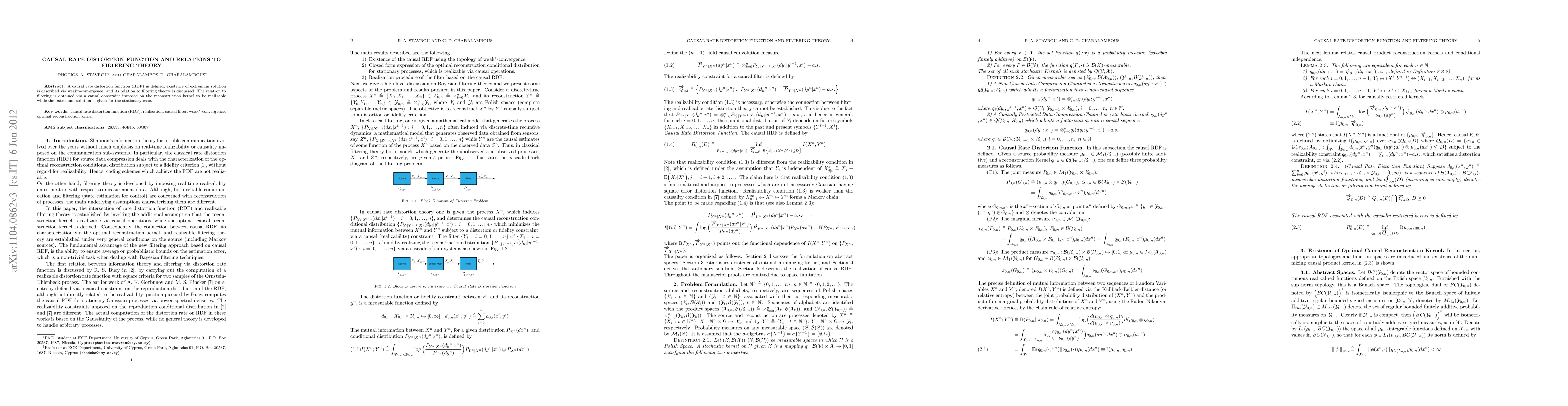 Summary: This paper defines a causal rate distortion function and presents its solution, linking it to filtering theory through a causal constraint on the reconstruction kernel, ensuring realizability.