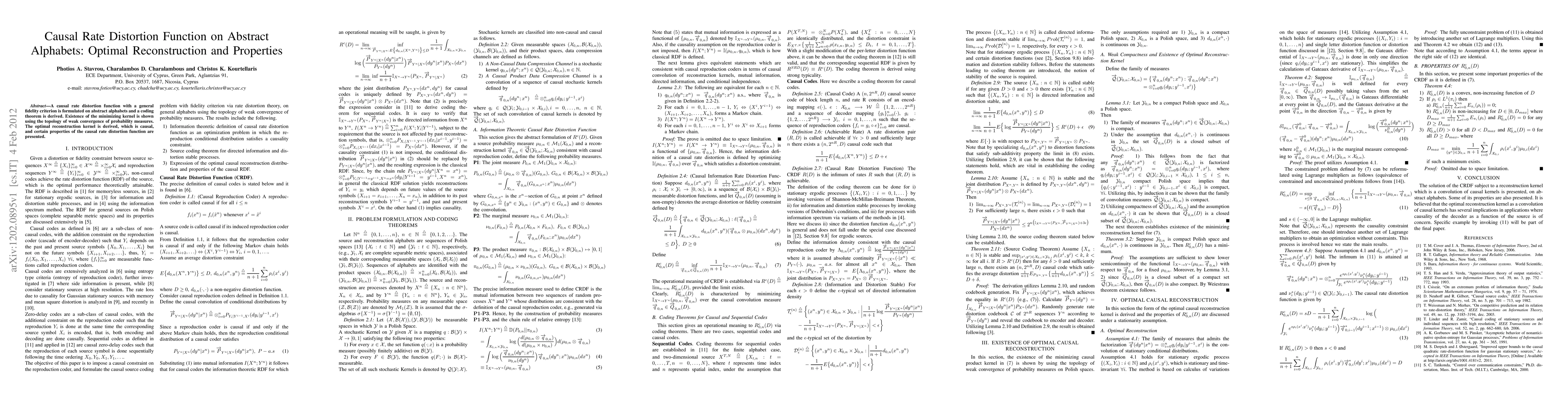 This paper formulates a causal rate distortion function on abstract alphabets, deriving a coding theorem and proving the existence of a minimizing kernel via weak convergence topology. The study also presents the optimal causal reconstruction kernel and explores properties of the causal rate distortion function.