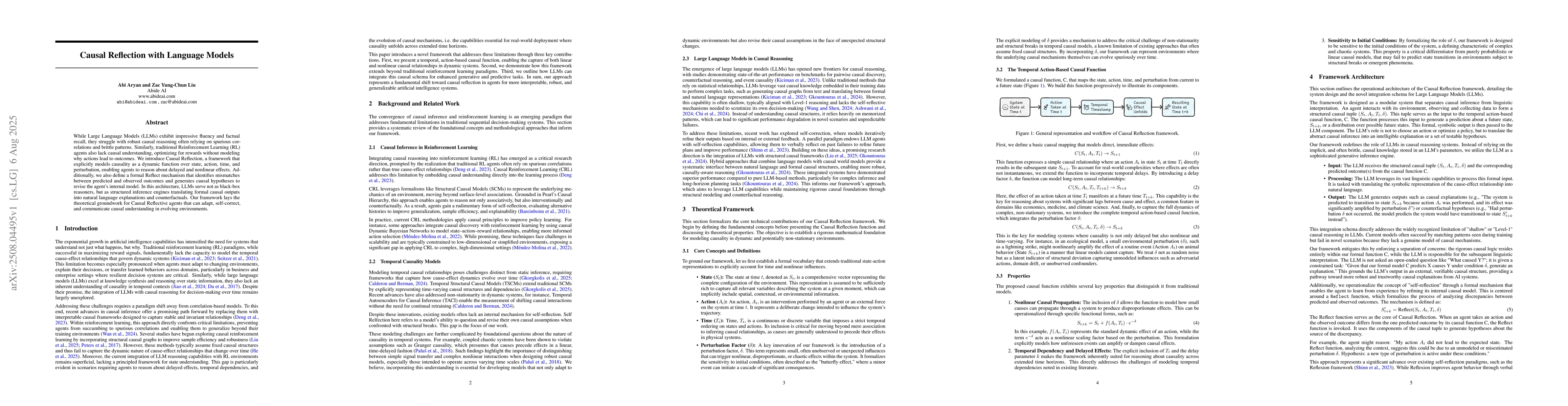 While LLMs exhibit impressive fluency and factual recall, they struggle with robust causal reasoning, often relying on spurious correlations and brittle patterns. Similarly, traditional Reinforcement Learning agents also lack causal understanding, optimizing for rewards without modeling why actions lead to outcomes. We introduce Causal Reflection, a framework that explicitly models causality as a dynamic function over state, action, time, and perturbation, enabling agents to reason about delayed and nonlinear effects. Additionally, we define a formal Reflect mechanism that identifies mismatches between predicted and observed outcomes and generates causal hypotheses to revise the agent's internal model. In this architecture, LLMs serve not as black-box reasoners, but as structured inference engines translating formal causal outputs into natural language explanations and counterfactuals. Our framework lays the theoretical groundwork for Causal Reflective agents that can adapt, self-correct, and communicate causal understanding in evolving environments.