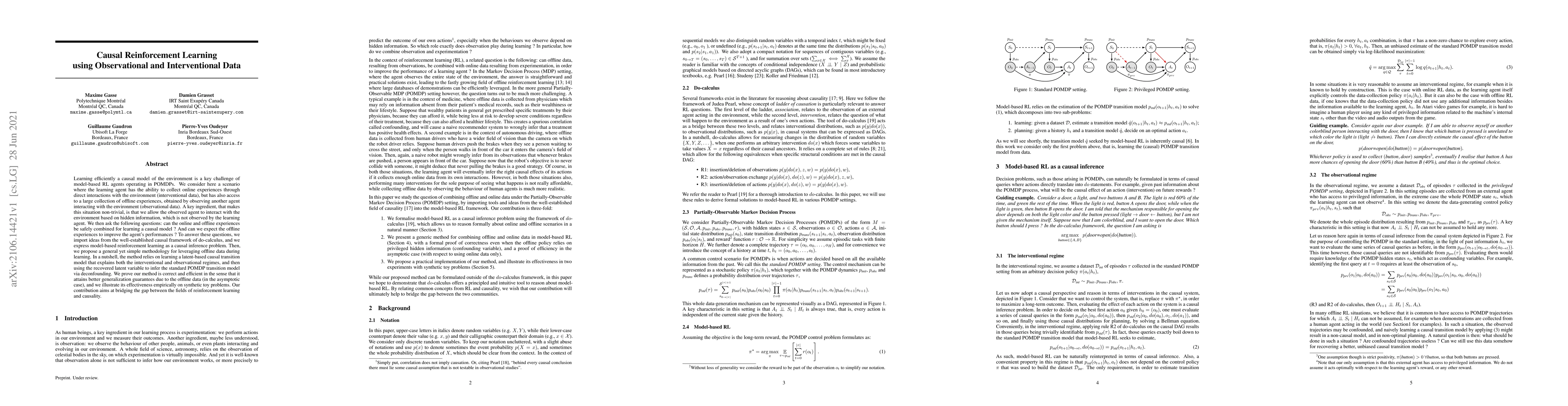 Learning efficiently a causal model of the environment is a key challenge of model-based RL agents operating in POMDPs. We consider here a scenario where the learning agent has the ability to collect online experiences through direct interactions with the environment (interventional data), but has also access to a large collection of offline experiences, obtained by observing another agent interacting with the environment (observational data). A key ingredient, that makes this situation non-trivial, is that we allow the observed agent to interact with the environment based on hidden information, which is not observed by the learning agent. We then ask the following questions: can the online and offline experiences be safely combined for learning a causal model ? And can we expect the offline experiences to improve the agent's performances ? To answer these questions, we import ideas from the well-established causal framework of do-calculus, and we express model-based reinforcement learning as a causal inference problem. Then, we propose a general yet simple methodology for leveraging offline data during learning. In a nutshell, the method relies on learning a latent-based causal transition model that explains both the interventional and observational regimes, and then using the recovered latent variable to infer the standard POMDP transition model via deconfounding. We prove our method is correct and efficient in the sense that it attains better generalization guarantees due to the offline data (in the asymptotic case), and we illustrate its effectiveness empirically on synthetic toy problems. Our contribution aims at bridging the gap between the fields of reinforcement learning and causality.