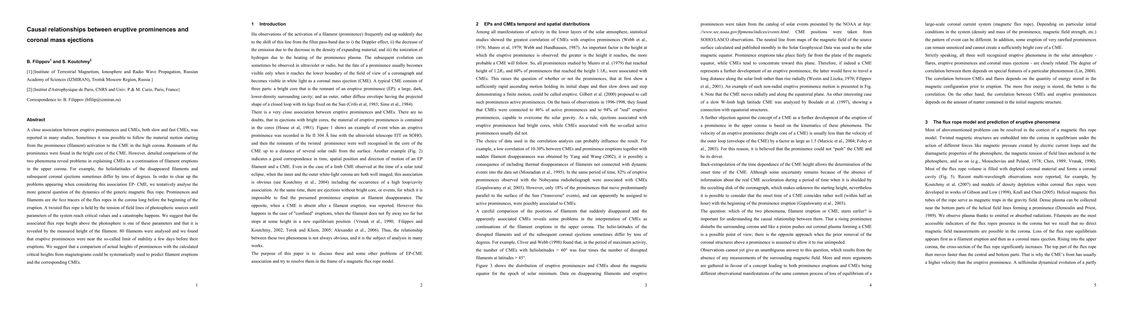 This study investigates the relationship between eruptive prominences and coronal mass ejections (CMEs), identifying discrepancies in their heliolatitudes and suggesting that magnetic flux rope dynamics play a crucial role. By analyzing 80 filaments, the researchers propose that comparing the real heights of prominences with critical heights from magnetograms can help predict eruptions and associated CMEs.