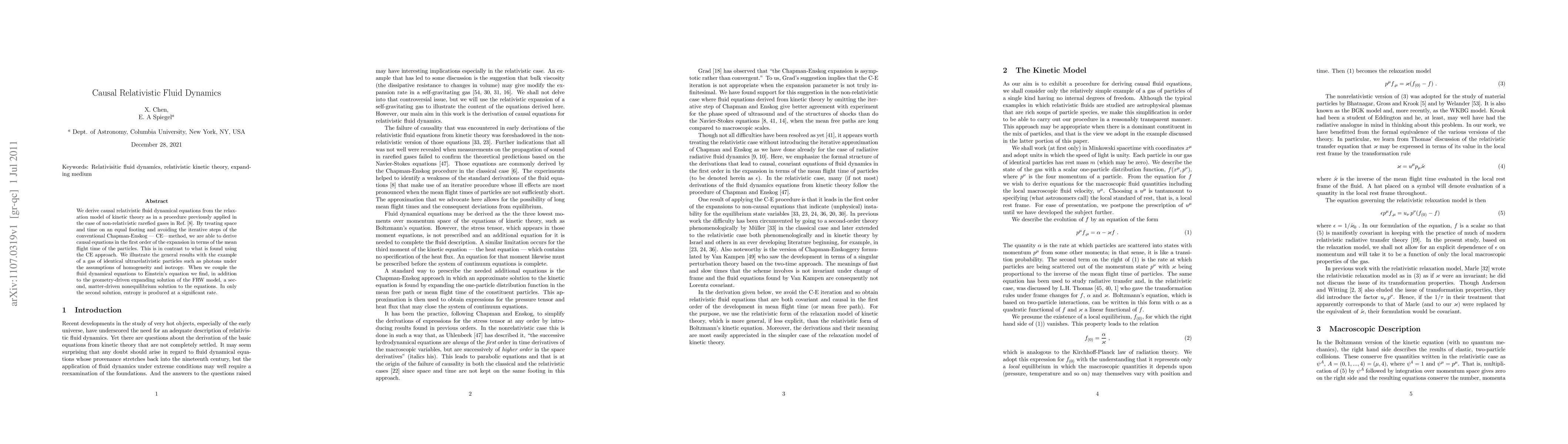 We derive causal relativistic fluid dynamical equations from the relaxation model of kinetic theory as in a procedure previously applied in the case of non-relativistic rarefied gases. By treating space and time on an equal footing and avoiding the iterative steps of the conventional Chapman-Enskog --- CE---method, we are able to derive causal equations in the first order of the expansion in terms of the mean flight time of the particles. This is in contrast to what is found using the CE approach. We illustrate the general results with the example of a gas of identical ultrarelativistic particles such as photons under the assumptions of homogeneity and isotropy. When we couple the fluid dynamical equations to Einstein's equation we find, in addition to the geometry-driven expanding solution of the FRW model, a second, matter-driven nonequilibrium solution to the equations. In only the second solution, entropy is produced at a significant rate.