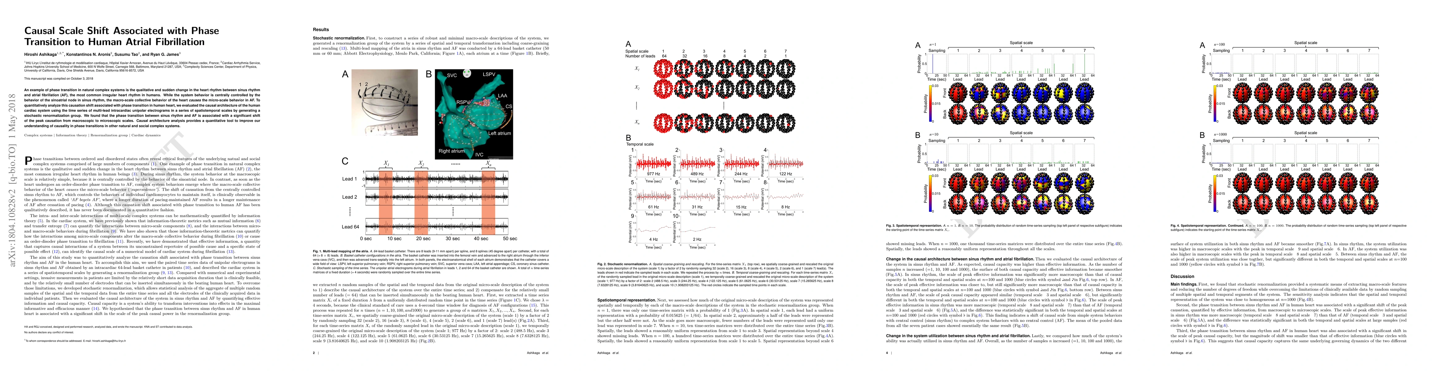 An example of phase transition in natural complex systems is the qualitative and sudden change in the heart rhythm between sinus rhythm and atrial fibrillation (AF), the most common irregular heart rhythm in humans. While the system behavior is centrally controlled by the behavior of the sinoatrial node in sinus rhythm, the macro-scale collective behavior of the heart causes the micro-scale behavior in AF. To quantitatively analyze this causation shift associated with phase transition in human heart, we evaluated the causal architecture of the human cardiac system using the time series of multi-lead intracardiac unipolar electrograms in a series of spatiotemporal scales by generating a stochastic renormalization group. We found that the phase transition between sinus rhythm and AF is associated with a significant shift of the peak causation from macroscopic to microscopic scales. Causal architecture analysis may improve our understanding of causality in phase transitions in other natural and social complex systems.