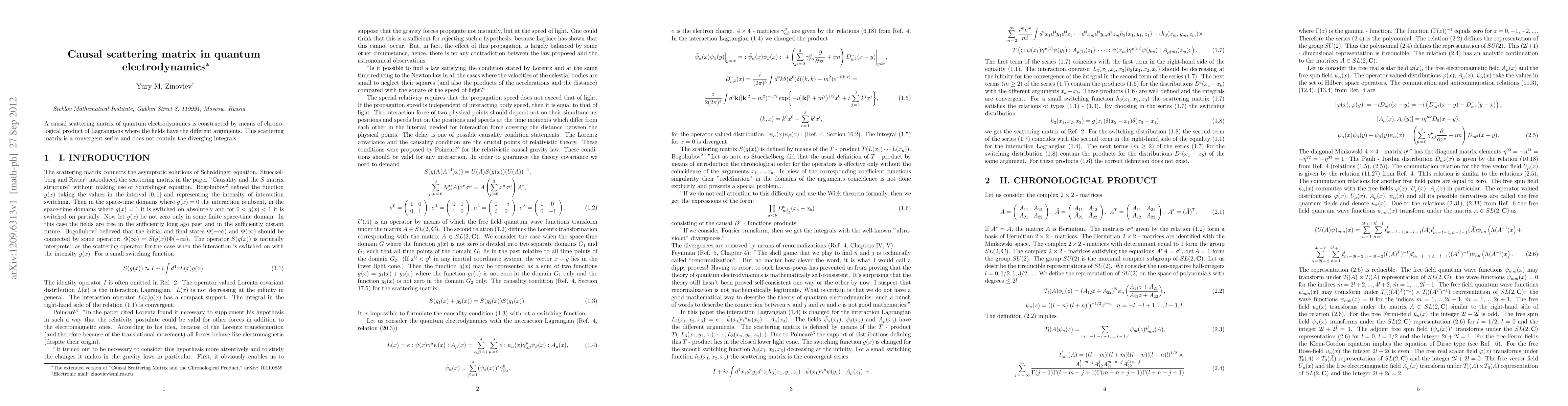 The paper constructs a causal scattering matrix in quantum electrodynamics using a chronological product of Lagrangians with distinct field arguments, resulting in a convergent series without divergent integrals. This approach provides a consistent framework for scattering processes in QED.