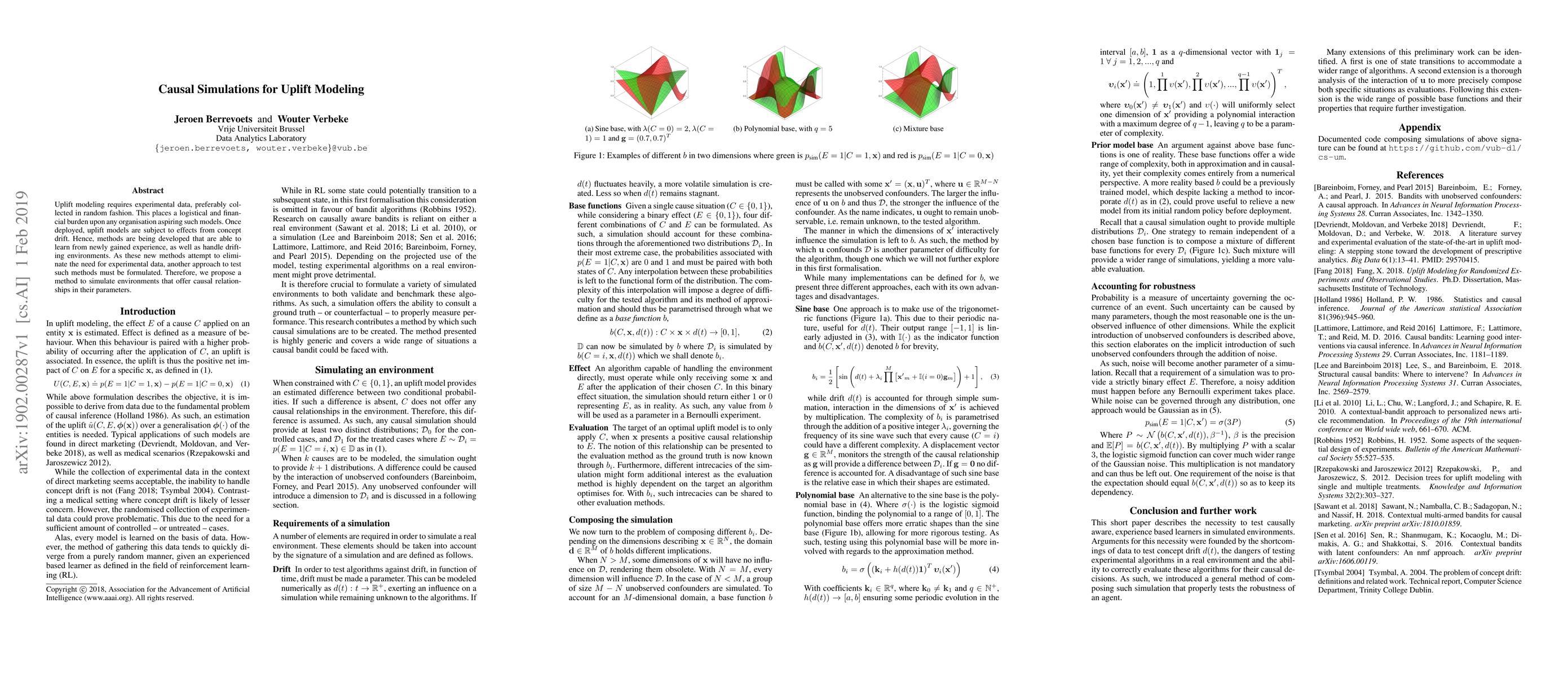 Uplift modeling requires experimental data, preferably collected in random fashion. This places a logistical and financial burden upon any organisation aspiring such models. Once deployed, uplift models are subject to effects from concept drift. Hence, methods are being developed that are able to learn from newly gained experience, as well as handle drifting environments. As these new methods attempt to eliminate the need for experimental data, another approach to test such methods must be formulated. Therefore, we propose a method to simulate environments that offer causal relationships in their parameters.
