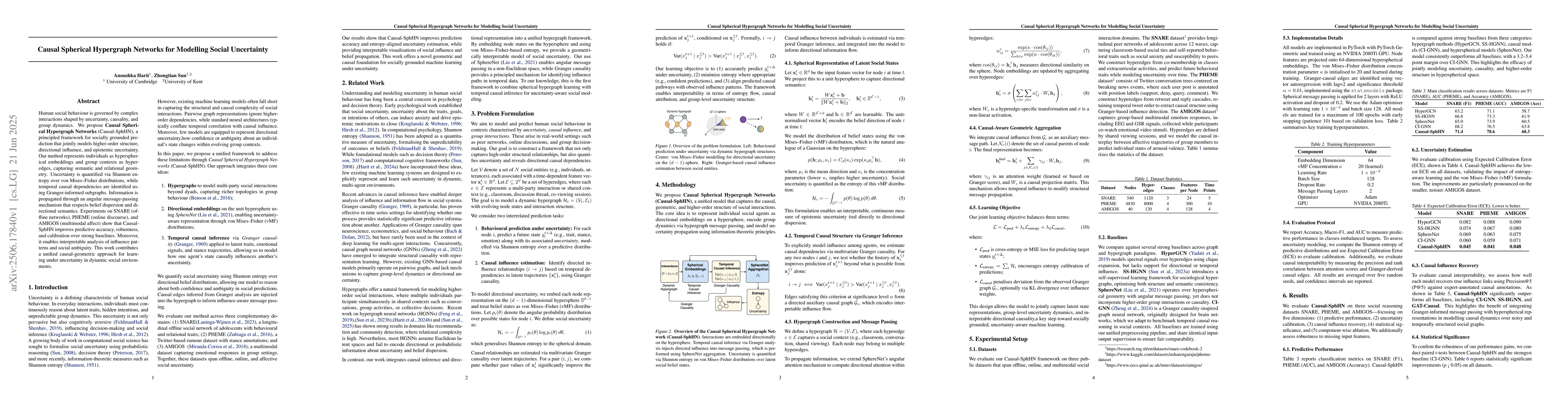 Human social behaviour is governed by complex interactions shaped by uncertainty, causality, and group dynamics. We propose Causal Spherical Hypergraph Networks (Causal-SphHN), a principled framework for socially grounded prediction that jointly models higher-order structure, directional influence, and epistemic uncertainty. Our method represents individuals as hyperspherical embeddings and group contexts as hyperedges, capturing semantic and relational geometry. Uncertainty is quantified via Shannon entropy over von Mises-Fisher distributions, while temporal causal dependencies are identified using Granger-informed subgraphs. Information is propagated through an angular message-passing mechanism that respects belief dispersion and directional semantics. Experiments on SNARE (offline networks), PHEME (online discourse), and AMIGOS (multimodal affect) show that Causal-SphHN improves predictive accuracy, robustness, and calibration over strong baselines. Moreover, it enables interpretable analysis of influence patterns and social ambiguity. This work contributes a unified causal-geometric approach for learning under uncertainty in dynamic social environments.