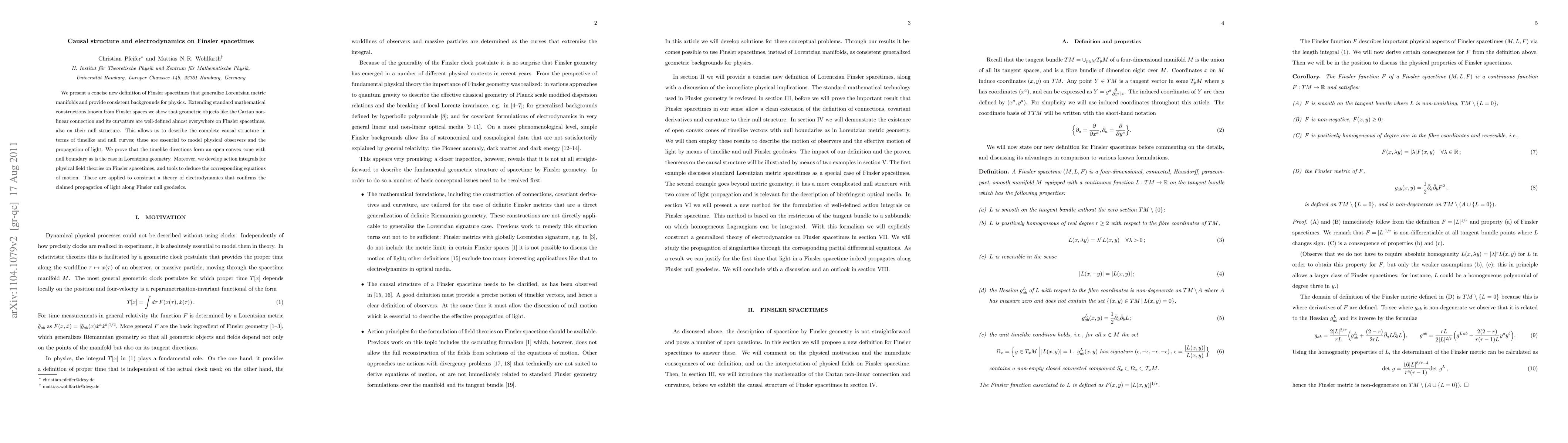 This paper defines Finsler spacetimes as generalized Lorentzian metric manifolds and establishes well-defined geometric objects, such as the Cartan non-linear connection and curvature. It models causal structures and develops action integrals and equations of motion for field theories, leading to a theory of electrodynamics on Finsler spacetimes.