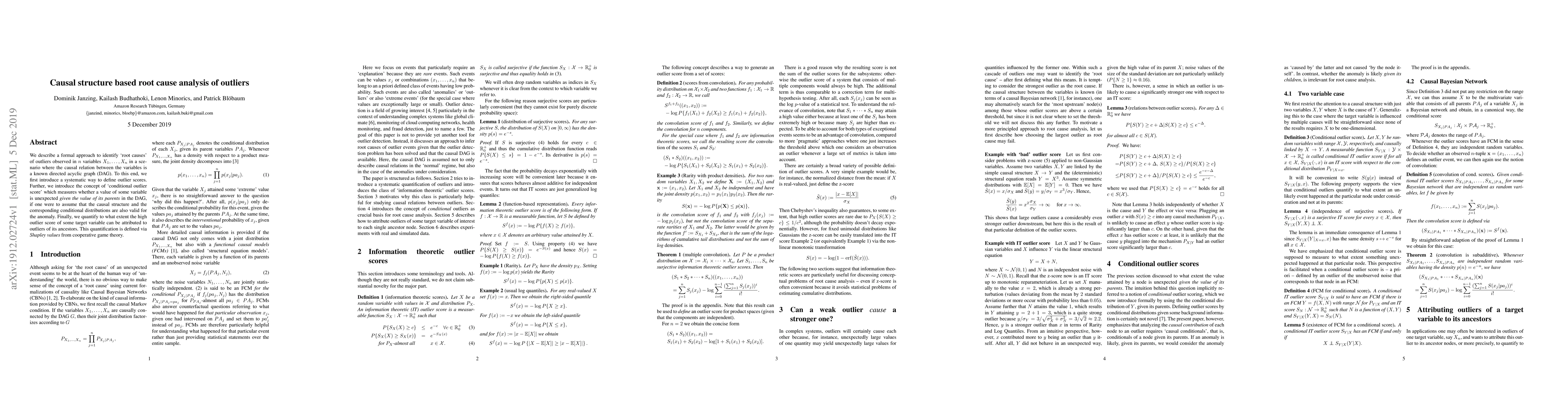This paper proposes a method to identify root causes of outliers in a dataset using a known causal DAG, defining outlier scores and conditional outlier scores to assess unexpected values given parent variables, and attributing outlier impact via Shapley values.