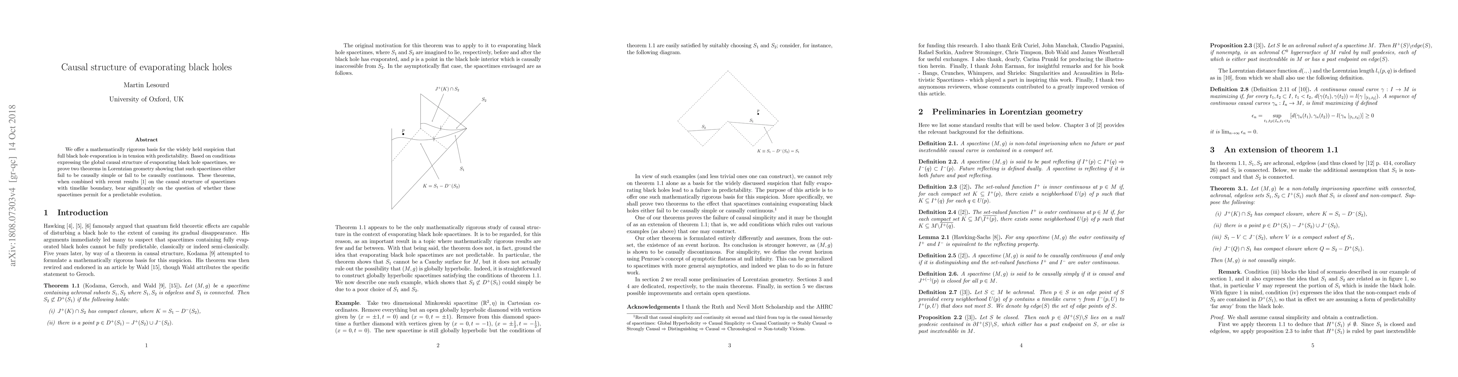 We offer a mathematically rigorous basis for the widely held suspicion that full black hole evaporation is in tension with predictability. Based on conditions expressing the global causal structure of evaporating black hole spacetimes, we prove two theorems in Lorentzian geometry showing that such spacetimes either fail to be causally simple or fail to be causally continuous. These theorems, when combined with recent results \cite{AM} on the causal structure of spacetimes with timelike boundary, bear significantly on the question of whether these spacetimes permit for a predictable evolution.