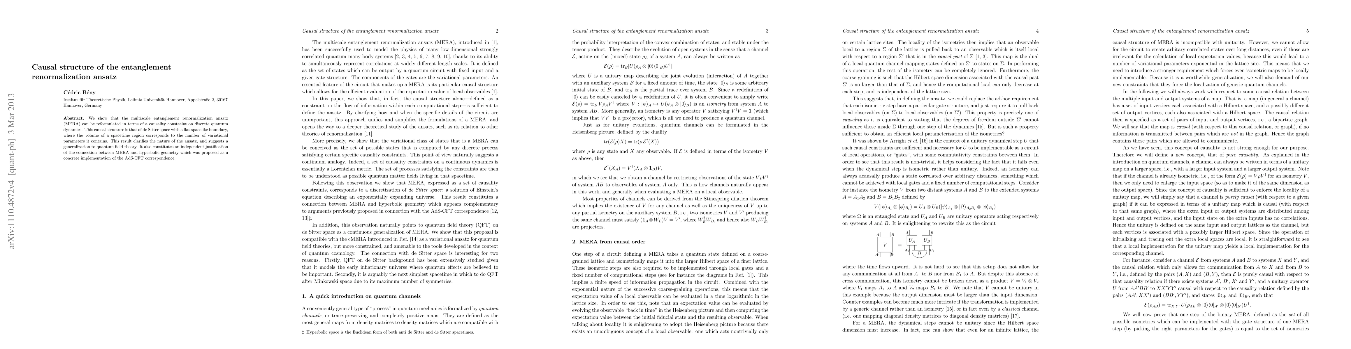 The research reformulates the multiscale entanglement renormalization ansatz (MERA) in terms of a causality constraint, revealing a de Sitter space structure with a flat boundary, which clarifies its nature and suggests a link to quantum field theory. This also provides an independent justification for the MERA-hyperbolic geometry connection, supporting the AdS-CFT correspondence.