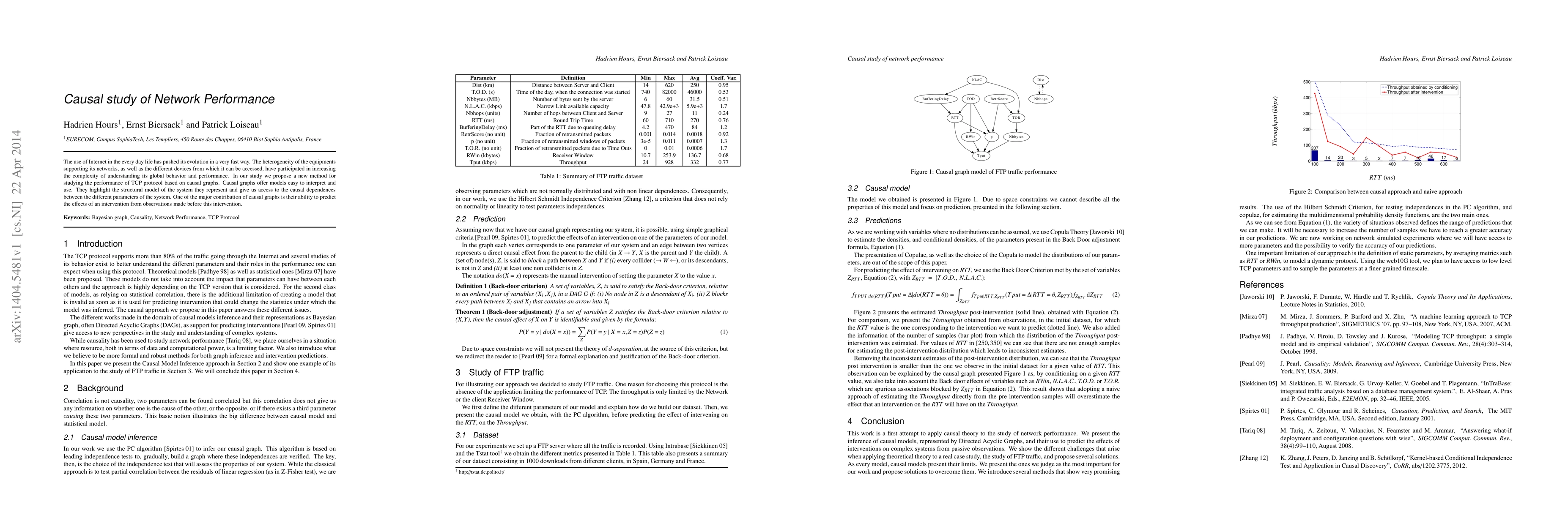 The use of Internet in the every day life has pushed its evolution in a very fast way. The heterogeneity of the equipments supporting its networks, as well as the different devices from which it can be accessed, have participated in increasing the complexity of understanding its global behavior and performance. In our study we propose a new method for studying the performance of TCP protocol based on causal graphs. Causal graphs offer models easy to interpret and use. They highlight the structural model of the system they represent and give us access to the causal dependences between the different parameters of the system. One of the major contribution of causal graphs is their ability to predict the effects of an intervention from observations made before this intervention.