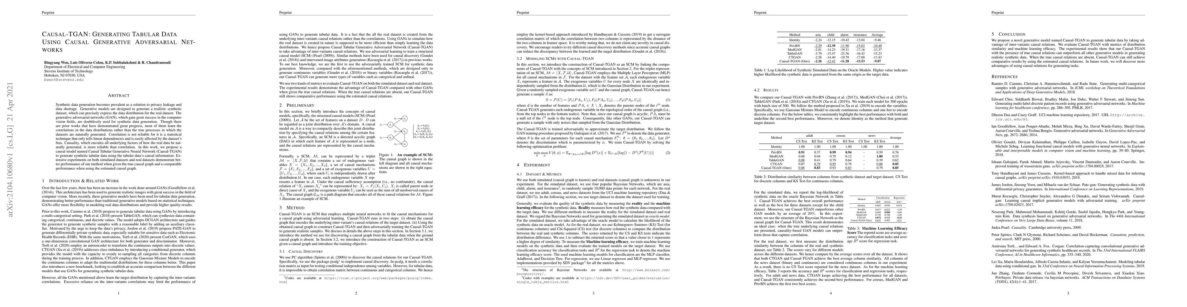 The paper proposes Causal-TGAN, a generative adversarial network that leverages causal information to generate synthetic tabular data, aiming to overcome the limitations of correlation-based methods. Experiments show that Causal-TGAN performs better with true causal graphs and comparably well with estimated ones.
