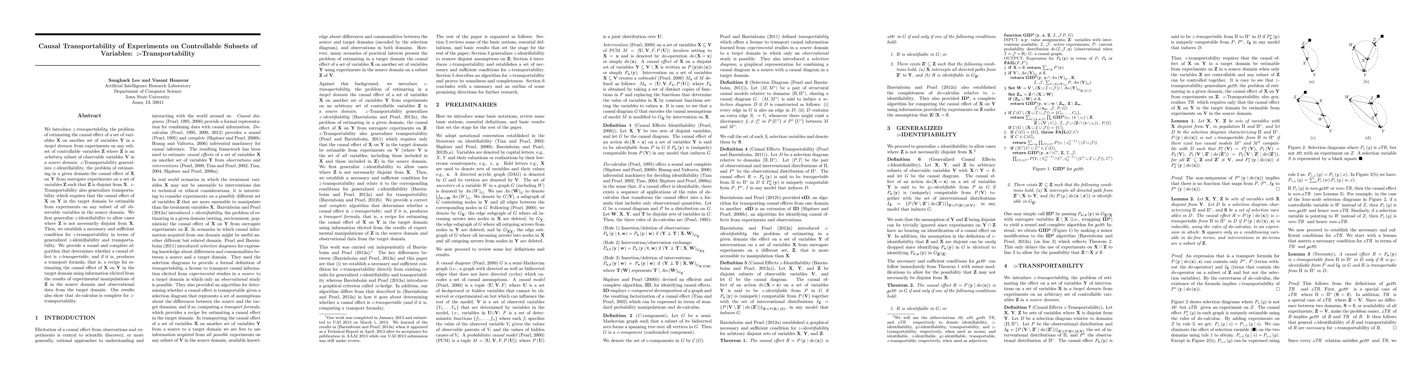 We introduce z-transportability, the problem of estimating the causal effect of a set of variables X on another set of variables Y in a target domain from experiments on any subset of controllable variables Z where Z is an arbitrary subset of observable variables V in a source domain. z-Transportability generalizes z-identifiability, the problem of estimating in a given domain the causal effect of X on Y from surrogate experiments on a set of variables Z such that Z is disjoint from X;. z-Transportability also generalizes transportability which requires that the causal effect of X on Y in the target domain be estimable from experiments on any subset of all observable variables in the source domain. We first generalize z-identifiability to allow cases where Z is not necessarily disjoint from X. Then, we establish a necessary and sufficient condition for z-transportability in terms of generalized z-identifiability and transportability. We provide a correct and complete algorithm that determines whether a causal effect is z-transportable; and if it is, produces a transport formula, that is, a recipe for estimating the causal effect of X on Y in the target domain using information elicited from the results of experimental manipulations of Z in the source domain and observational data from the target domain. Our results also show that do-calculus is complete for z-transportability.