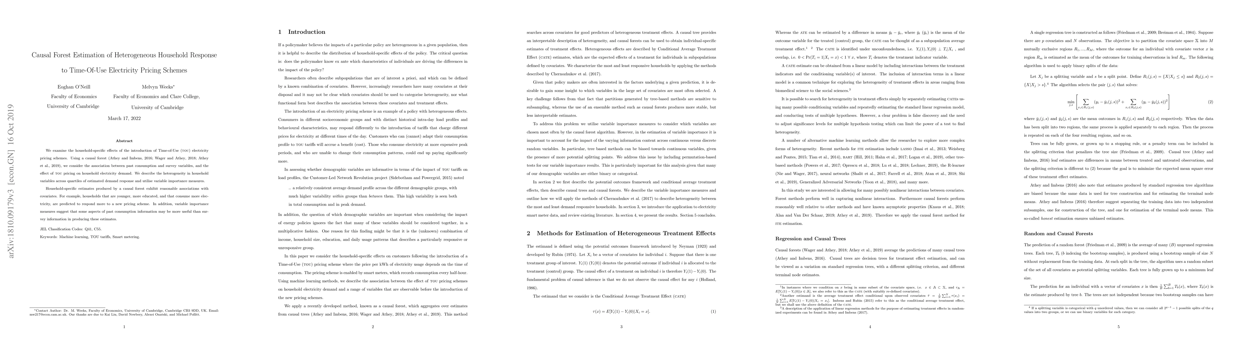 This study uses causal forest analysis to examine how households respond differently to time-of-use electricity pricing schemes based on their age, education level, and past consumption habits. The findings suggest that certain household characteristics can predict a higher demand response to new pricing schemes.