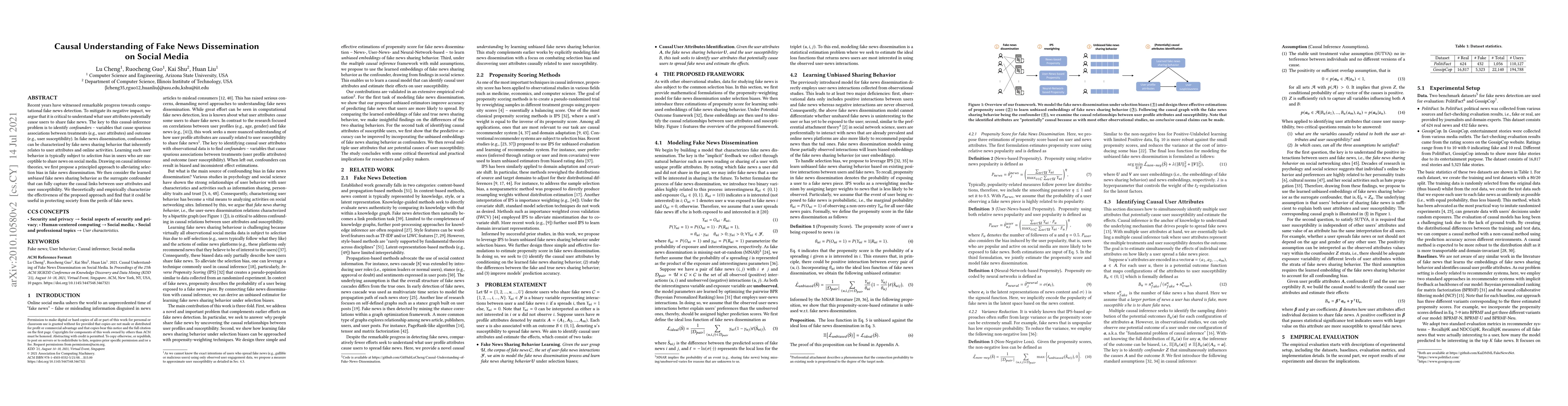 Recent years have witnessed remarkable progress towards computational fake news detection. To mitigate its negative impact, we argue that it is critical to understand what user attributes potentially cause users to share fake news. The key to this causal-inference problem is to identify confounders -- variables that cause spurious associations between treatments (e.g., user attributes) and outcome (e.g., user susceptibility). In fake news dissemination, confounders can be characterized by fake news sharing behavior that inherently relates to user attributes and online activities. Learning such user behavior is typically subject to selection bias in users who are susceptible to share news on social media. Drawing on causal inference theories, we first propose a principled approach to alleviating selection bias in fake news dissemination. We then consider the learned unbiased fake news sharing behavior as the surrogate confounder that can fully capture the causal links between user attributes and user susceptibility. We theoretically and empirically characterize the effectiveness of the proposed approach and find that it could be useful in protecting society from the perils of fake news.