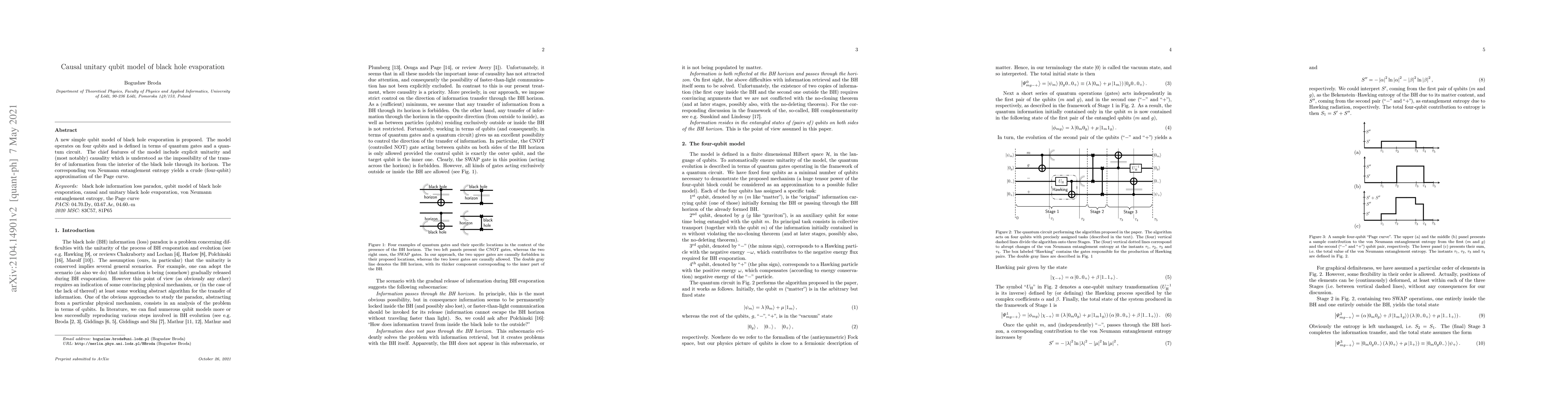 This paper proposes a simple four-qubit model for black hole evaporation, emphasizing explicit unitarity and causality to prevent information transfer through the event horizon. The model approximates the Page curve for von Neumann entanglement entropy.