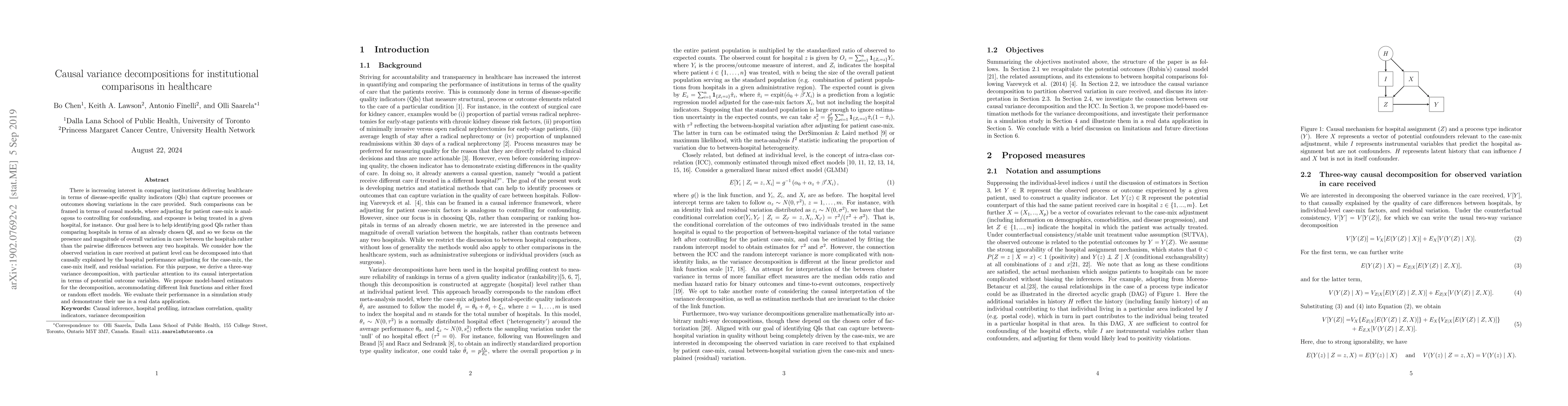 There is increasing interest in comparing institutions delivering healthcare in terms of disease-specific quality indicators (QIs) that capture processes or outcomes showing variations in the care provided. Such comparisons can be framed in terms of causal models, where adjusting for patient case-mix is analogous to controlling for confounding, and exposure is being treated in a given hospital, for instance. Our goal here is to help identifying good QIs rather than comparing hospitals in terms of an already chosen QI, and so we focus on the presence and magnitude of overall variation in care between the hospitals rather than the pairwise differences between any two hospitals. We consider how the observed variation in care received at patient level can be decomposed into that causally explained by the hospital performance adjusting for the case-mix, the case-mix itself, and residual variation. For this purpose, we derive a three-way variance decomposition, with particular attention to its causal interpretation in terms of potential outcome variables. We propose model-based estimators for the decomposition, accommodating different link functions and either fixed or random effect models. We evaluate their performance in a simulation study and demonstrate their use in a real data application.