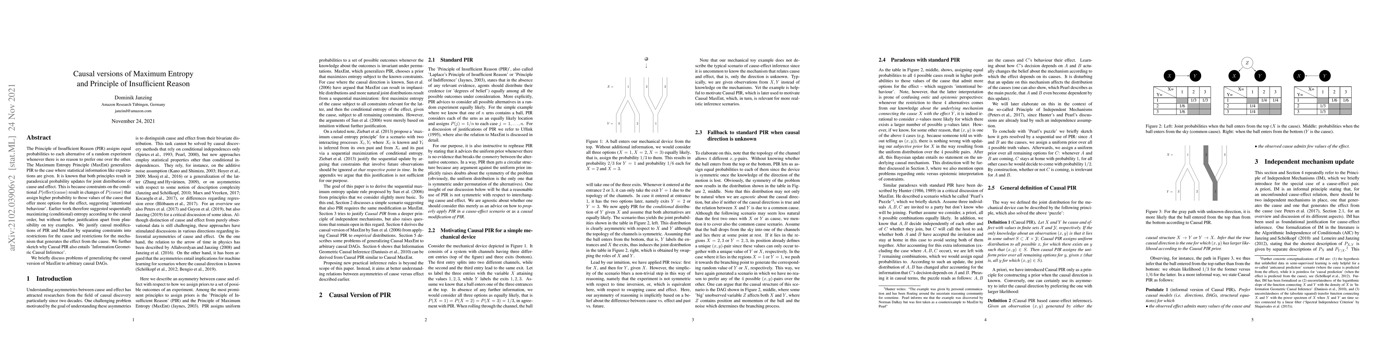 The Principle of Insufficient Reason (PIR) assigns equal probabilities to each alternative of a random experiment whenever there is no reason to prefer one over the other. The Maximum Entropy Principle (MaxEnt) generalizes PIR to the case where statistical information like expectations are given. It is known that both principles result in paradoxical probability updates for joint distributions of cause and effect. This is because constraints on the conditional P(effect|cause) result in changes of P(cause) that assign higher probability to those values of the cause that offer more options for the effect, suggesting "intentional behaviour". Earlier work therefore suggested sequentially maximizing (conditional) entropy according to the causal order, but without further justification apart from plausibility on toy examples. We justify causal modifications of PIR and MaxEnt by separating constraints into restrictions for the cause and restrictions for the mechanism that generates the effect from the cause. We further sketch why Causal PIR also entails "Information Geometric Causal Inference". We briefly discuss problems of generalizing the causal version of MaxEnt to arbitrary causal DAGs.