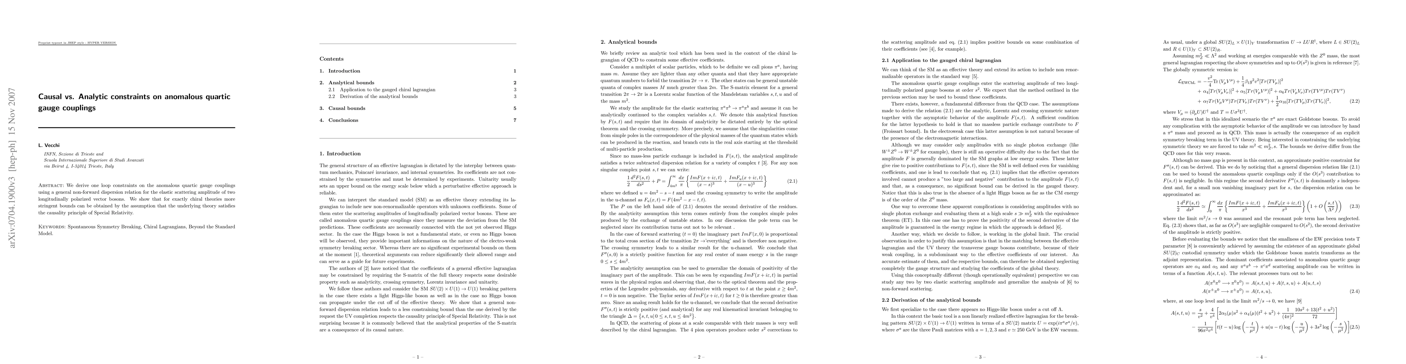 We derive one loop constraints on the anomalous quartic gauge couplings using a general non-forward dispersion relation for the elastic scattering amplitude of two longitudinally polarized vector bosons. We compare this result with another one derived by the assumption that the underlying theory satisfies the causality principle of Special Relativity and show that this latter is more constraining.