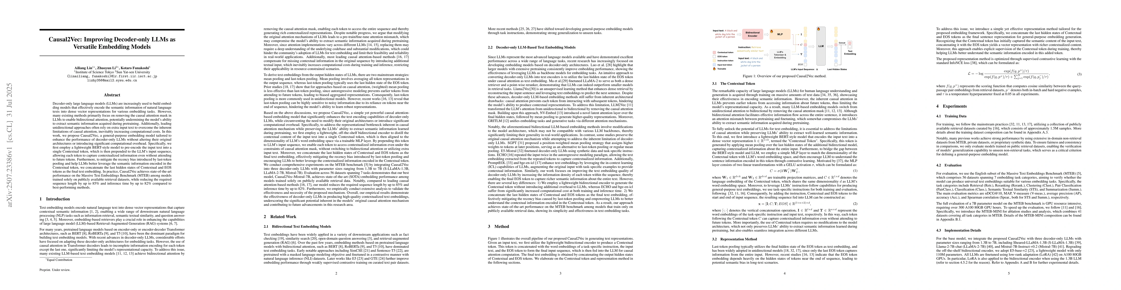 Decoder-only large language models (LLMs) are increasingly used to build embedding models that effectively encode the semantic information of natural language texts into dense vector representations for various embedding tasks. However, many existing methods primarily focus on removing the causal attention mask in LLMs to enable bidirectional attention, potentially undermining the model's ability to extract semantic information acquired during pretraining. Additionally, leading unidirectional approaches often rely on extra input text to overcome the inherent limitations of causal attention, inevitably increasing computational costs. In this work, we propose Causal2Vec, a general-purpose embedding model tailored to enhance the performance of decoder-only LLMs without altering their original architectures or introducing significant computational overhead. Specifically, we first employ a lightweight BERT-style model to pre-encode the input text into a single Contextual token, which is then prepended to the LLM's input sequence, allowing each token to capture contextualized information even without attending to future tokens. Furthermore, to mitigate the recency bias introduced by last-token pooling and help LLMs better leverage the semantic information encoded in the Contextual token, we concatenate the last hidden states of Contextual and EOS tokens as the final text embedding. In practice, Causal2Vec achieves state-of-the-art performance on the Massive Text Embeddings Benchmark (MTEB) among models trained solely on publicly available retrieval datasets, while reducing the required sequence length by up to 85% and inference time by up to 82% compared to best-performing methods.