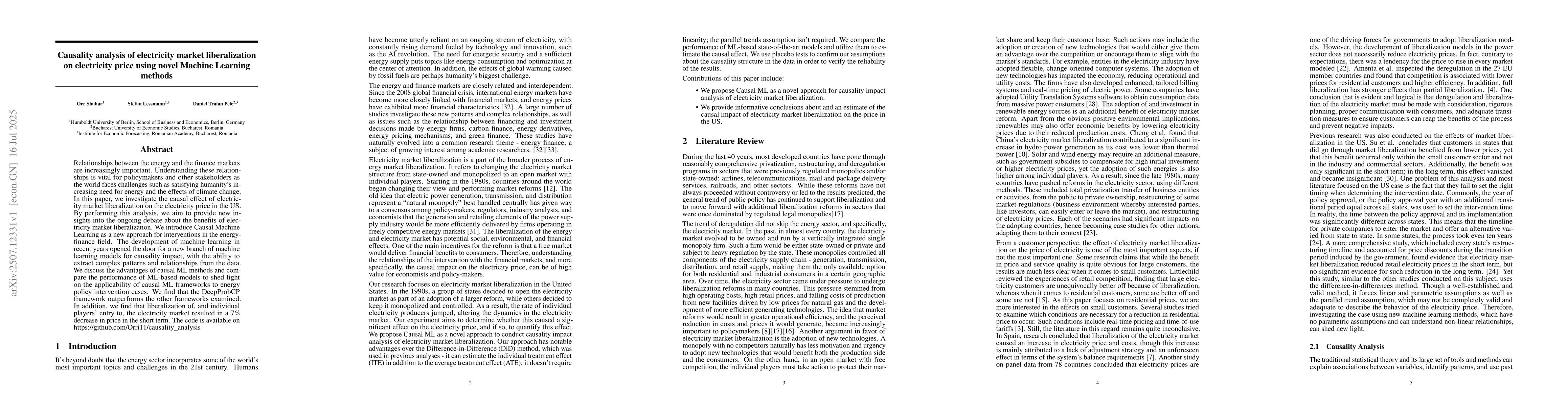 Relationships between the energy and the finance markets are increasingly important. Understanding these relationships is vital for policymakers and other stakeholders as the world faces challenges such as satisfying humanity's increasing need for energy and the effects of climate change. In this paper, we investigate the causal effect of electricity market liberalization on the electricity price in the US. By performing this analysis, we aim to provide new insights into the ongoing debate about the benefits of electricity market liberalization. We introduce Causal Machine Learning as a new approach for interventions in the energy-finance field. The development of machine learning in recent years opened the door for a new branch of machine learning models for causality impact, with the ability to extract complex patterns and relationships from the data. We discuss the advantages of causal ML methods and compare the performance of ML-based models to shed light on the applicability of causal ML frameworks to energy policy intervention cases. We find that the DeepProbCP framework outperforms the other frameworks examined. In addition, we find that liberalization of, and individual players' entry to, the electricity market resulted in a 7% decrease in price in the short term.