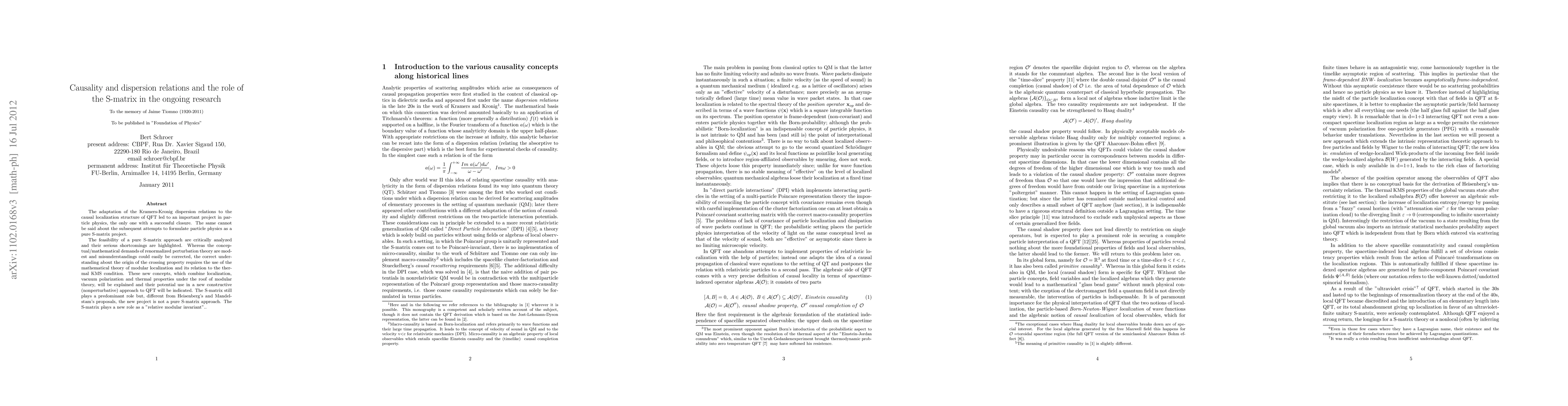 The adaptation of the Kramers-Kronig dispersion relations to the causal localization structure of QFT led to an important project in particle physics, the only one with a successful closure. The same cannot be said about the subsequent attempts to formulate particle physics as a pure S-matrix project. The feasibility of a pure S-matrix approach are critically analyzed and their serious shortcomings are highlighted. Whereas the conceptual/mathematical demands of renormalized perturbation theory are modest and misunderstandings could easily be corrected, the correct understanding about the origin of the crossing property requires the use of the mathematical theory of modular localization and its relation to the thermal KMS condition. These new concepts, which combine localization, vacuum polarization and thermal properties under the roof of modular theory, will be explained and their potential use in a new constructive (nonperturbative) approach to QFT will be indicated. The S-matrix still plays a predominant role but, different from Heisenberg's and Mandelstam's proposals, the new project is not a pure S-matrix approach. The S-matrix plays a new role as a "relative modular invariant"..