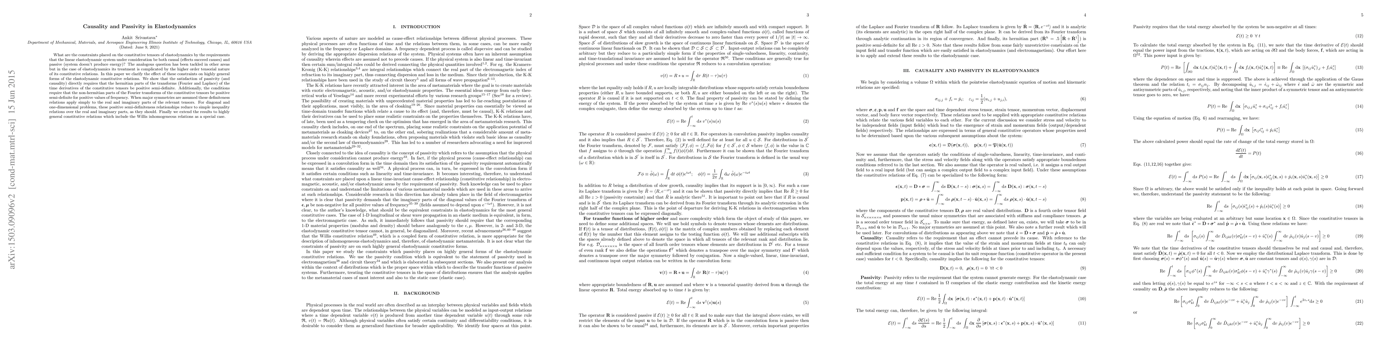 This paper investigates the constraints on elastodynamic constitutive tensors imposed by causality and passivity. It demonstrates that passivity and causality require the hermitian parts of Fourier transforms of time derivatives to be positive semi-definite, while the non-hermitian parts must be positive semi-definite for positive frequencies and negative semi-definite for negative frequencies, simplifying under major symmetries.