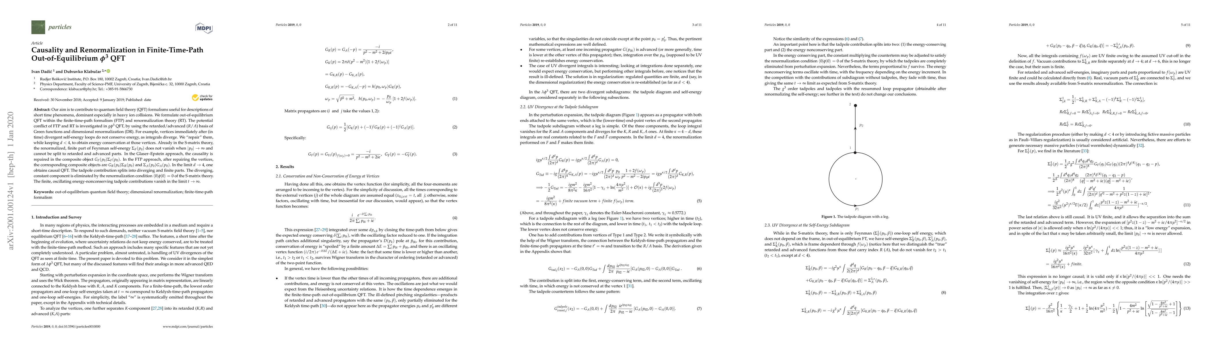 Our aim is to contribute to quantum field theory (QFT) formalisms useful for descriptions of short time phenomena, dominant especially in heavy ion collisions. We formulate out-of-equilibrium QFT within the finite-time-path formalism (FTP) and renormalization theory (RT). The potential conflict of FTP and RT is investigated in $g \phi^3$ QFT, by using the retarded/advanced ($R/A$) basis of Green functions and dimensional renormalization (DR). For example, vertices immediately after (in time) divergent self-energy loops do not conserve energy, as integrals diverge. We "repair" them, while keeping $d<4$, to obtain energy conservation at those vertices. Already in the S-matrix theory, the renormalized, finite part of Feynman self-energy $\Sigma_{F}(p_0)$ does not vanish when $|p_0|\rightarrow\infty$ and cannot be split to retarded and advanced parts. In the Glaser--Epstein approach, the causality is repaired in the composite object $G_F(p_0)\Sigma_{F}(p_0)$. In the FTP approach, after repairing the vertices, the corresponding composite objects are $G_R(p_0)\Sigma_{R}(p_0)$ and $\Sigma_{A}(p_0)G_A(p_0)$. In the limit $d\rightarrow 4$, one obtains causal QFT. The tadpole contribution splits into diverging and finite parts. The diverging, constant component is eliminated by the renormalization condition $\langle 0|\phi|0\rangle =0$ of the S-matrix theory. The finite, oscillating energy-nonconserving tadpole contributions vanish in the limit $t\rightarrow \infty $.