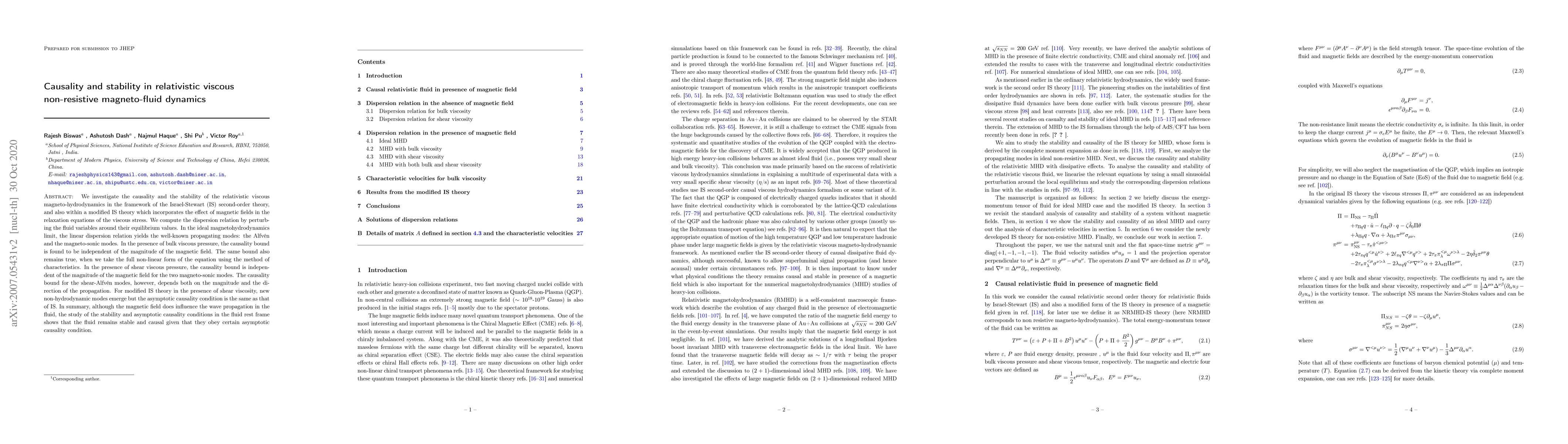 This paper examines the causality and stability in relativistic viscous magneto-fluid dynamics using the Israel-Stewart theory and a modified version. It finds that while magnetic fields influence wave propagation, the fluid remains stable and causal under certain asymptotic conditions, regardless of magnetic field strength.