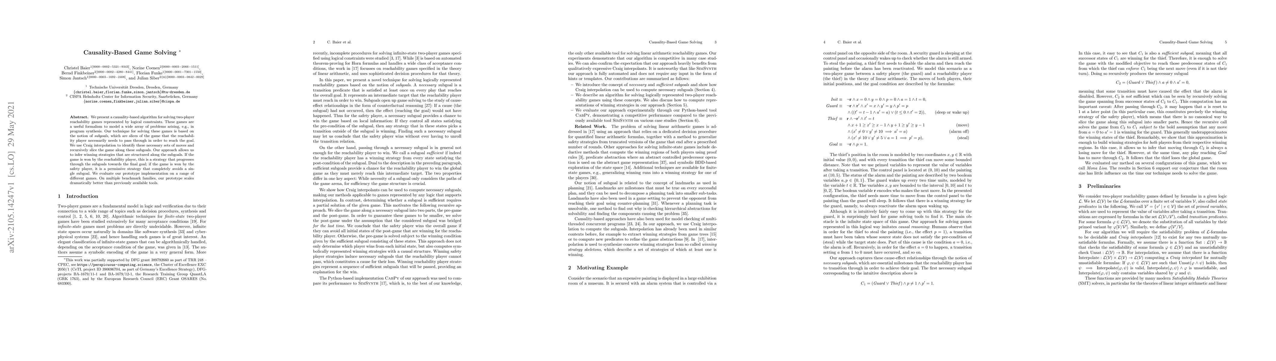 We present a causality-based algorithm for solving two-player reachability games represented by logical constraints. These games are a useful formalism to model a wide array of problems arising, e.g., in program synthesis. Our technique for solving these games is based on the notion of subgoals, which are slices of the game that the reachability player necessarily needs to pass through in order to reach the goal. We use Craig interpolation to identify these necessary sets of moves and recursively slice the game along these subgoals. Our approach allows us to infer winning strategies that are structured along the subgoals. If the game is won by the reachability player, this is a strategy that progresses through the subgoals towards the final goal; if the game is won by the safety player, it is a permissive strategy that completely avoids a single subgoal. We evaluate our prototype implementation on a range of different games. On multiple benchmark families, our prototype scales dramatically better than previously available tools.