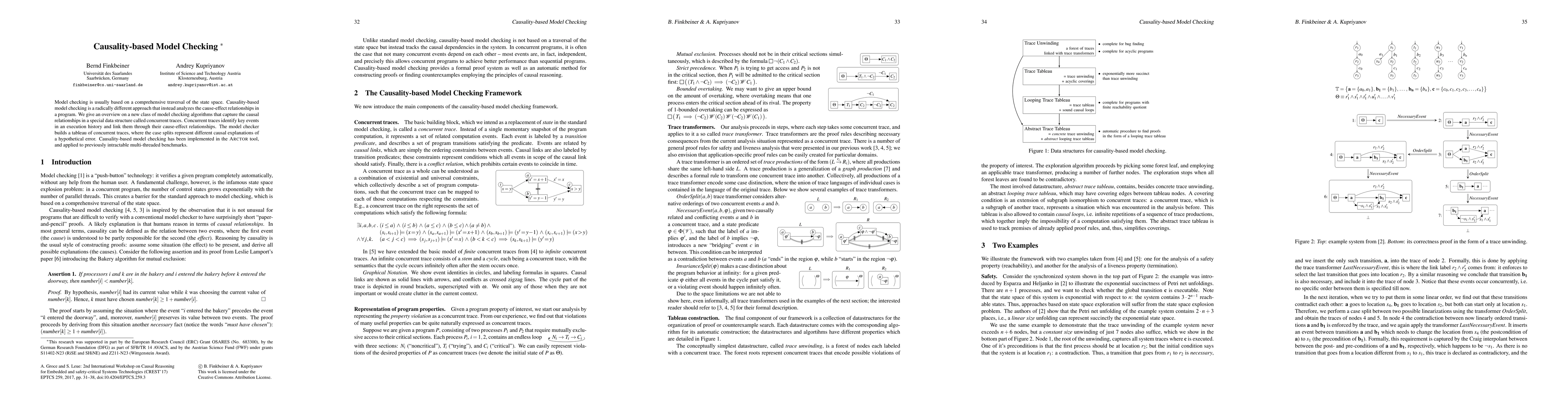 Model checking is usually based on a comprehensive traversal of the state space. Causality-based model checking is a radically different approach that instead analyzes the cause-effect relationships in a program. We give an overview on a new class of model checking algorithms that capture the causal relationships in a special data structure called concurrent traces. Concurrent traces identify key events in an execution history and link them through their cause-effect relationships. The model checker builds a tableau of concurrent traces, where the case splits represent different causal explanations of a hypothetical error. Causality-based model checking has been implemented in the ARCTOR tool, and applied to previously intractable multi-threaded benchmarks.