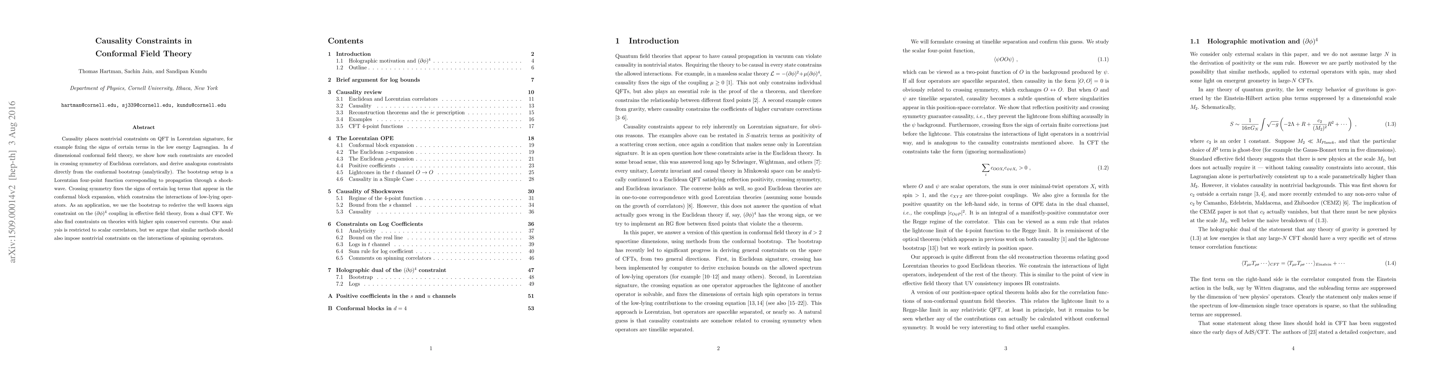 This paper demonstrates how causality constraints in d-dimensional conformal field theory are encoded in the crossing symmetry of Euclidean correlators, deriving these constraints via the conformal bootstrap. It applies these methods to rederive known sign constraints on $(\partial\phi)^4$ coupling and finds analogous constraints for higher spin conserved currents.