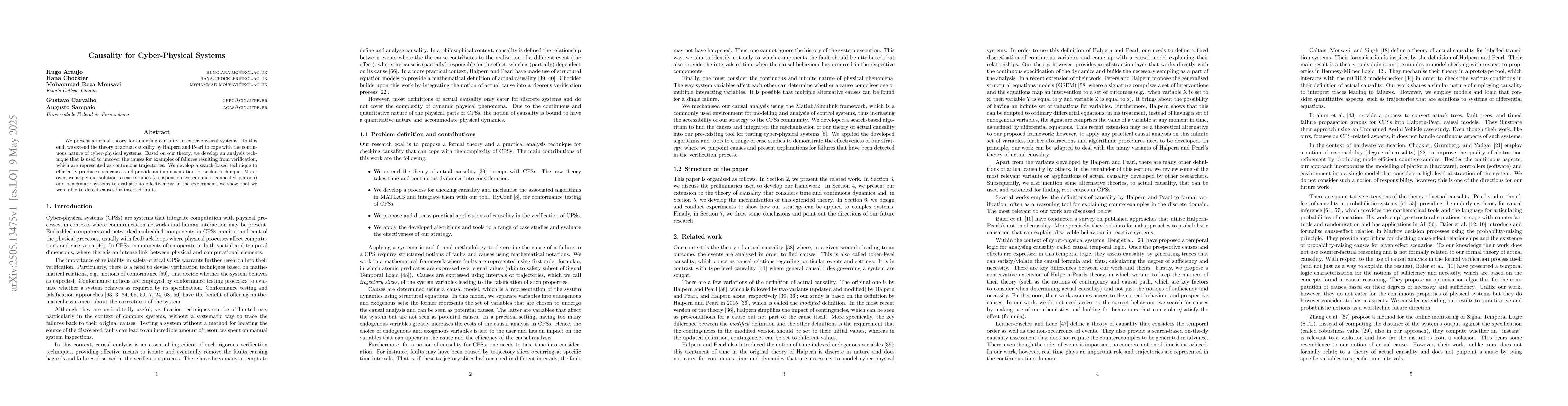 The research extends Halpern and Pearl's theory of actual causality to analyze causality in cyber-physical systems, incorporating their continuous nature. It develops an analysis technique based on this extended theory, using a search-based method to efficiently find causes for system failures represented as continuous trajectories.