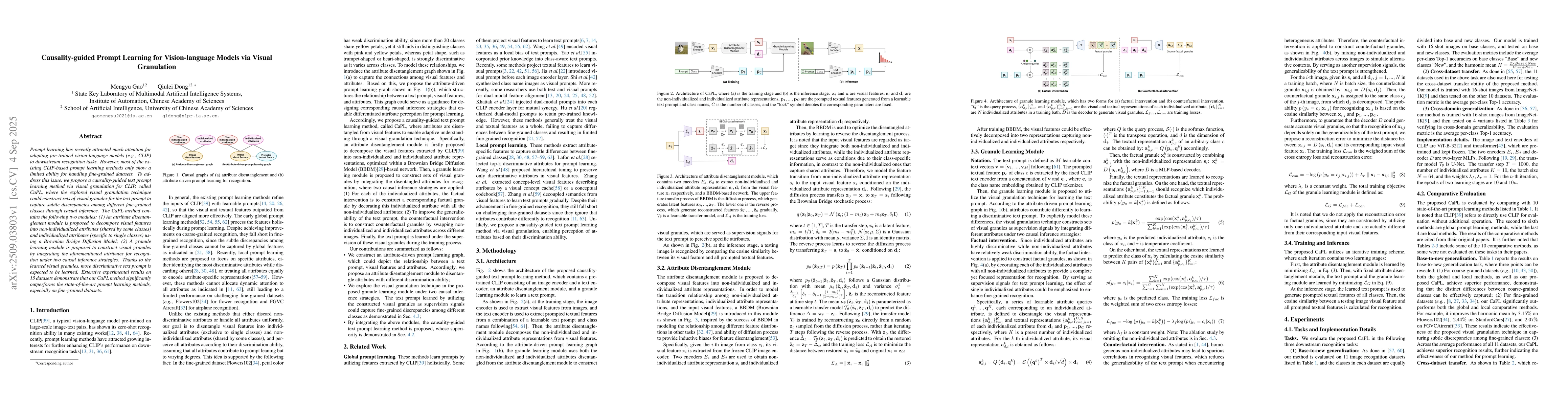 Prompt learning has recently attracted much attention for adapting pre-trained vision-language models (e.g., CLIP) to downstream recognition tasks. However, most of the existing CLIP-based prompt learning methods only show a limited ability for handling fine-grained datasets. To address this issue, we propose a causality-guided text prompt learning method via visual granulation for CLIP, called CaPL, where the explored visual granulation technique could construct sets of visual granules for the text prompt to capture subtle discrepancies among different fine-grained classes through casual inference. The CaPL method contains the following two modules: (1) An attribute disentanglement module is proposed to decompose visual features into non-individualized attributes (shared by some classes) and individualized attributes (specific to single classes) using a Brownian Bridge Diffusion Model; (2) A granule learning module is proposed to construct visual granules by integrating the aforementioned attributes for recognition under two causal inference strategies. Thanks to the learned visual granules, more discriminative text prompt is expected to be learned. Extensive experimental results on 15 datasets demonstrate that our CaPL method significantly outperforms the state-of-the-art prompt learning methods, especially on fine-grained datasets.