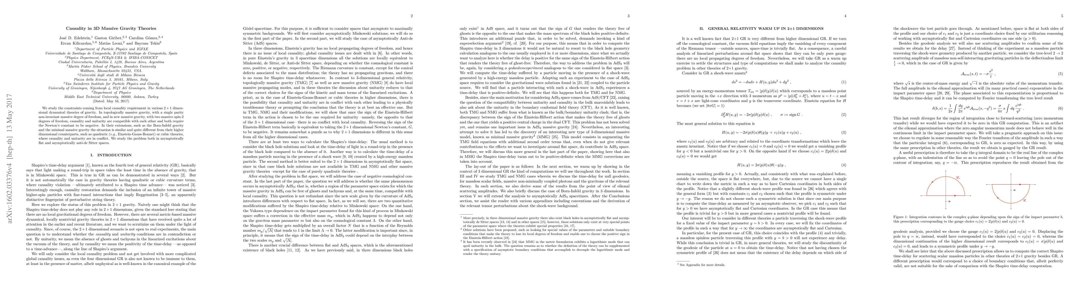 We study the constraints coming from local causality requirement in various $2+1$ dimensional dynamical theories of gravity. In topologically massive gravity, with a single parity non-invariant massive degree of freedom, and in new massive gravity, with two massive spin-$2$ degrees of freedom, causality and unitarity are compatible with each other and both require the Newton's constant to be negative. In their extensions, such as the Born-Infeld gravity and the minimal massive gravity the situation is similar and quite different from their higher dimensional counterparts, such as quadratic (e.g., Einstein-Gauss-Bonnet) or cubic theories, where causality and unitarity are in conflict. We study the problem both in asymptotically flat and asymptotically anti-de Sitter spaces.