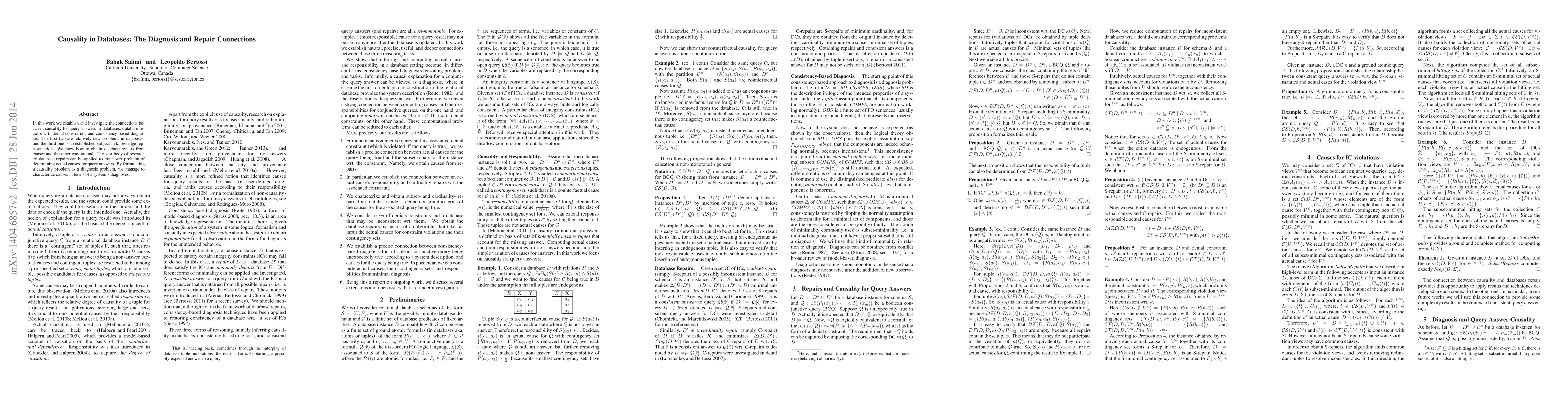 This paper explores the links between causality in database query answers, database repairs concerning denial constraints, and consistency-based diagnosis. It demonstrates how database repairs can be derived from causal information and vice versa, leveraging existing research on database repairs to address the newer problem of identifying actual causes for query answers.