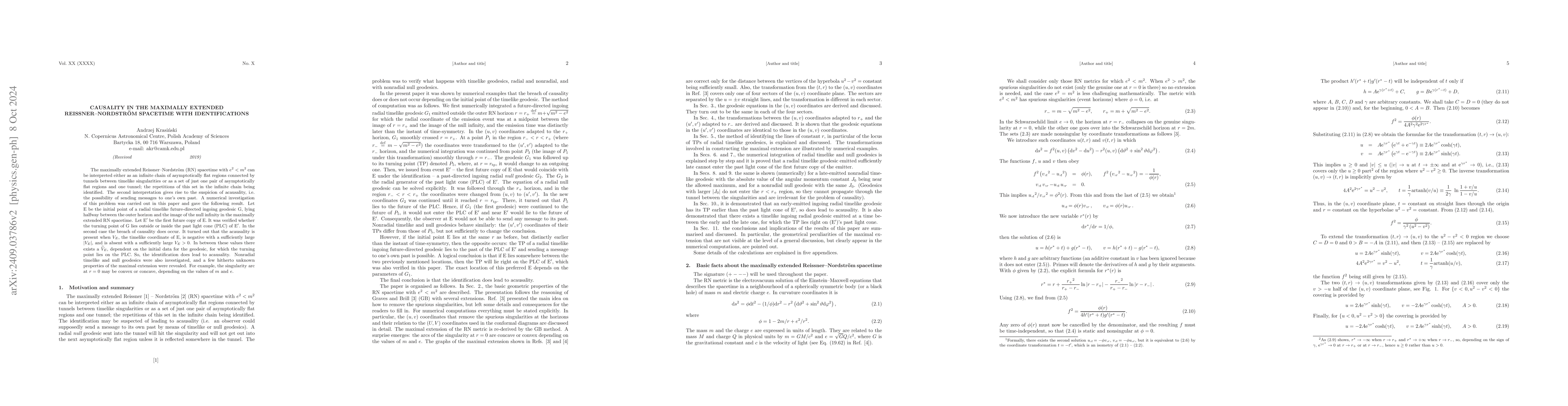 The study investigates the causality in the maximally extended Reissner-Nordström spacetime, revealing that identifications in this spacetime can lead to acausality when the timelike coordinate of a geodesic is sufficiently negative. The investigation also uncovers properties of nonradial geodesics and the singularity arc's shape at $r = 0$.