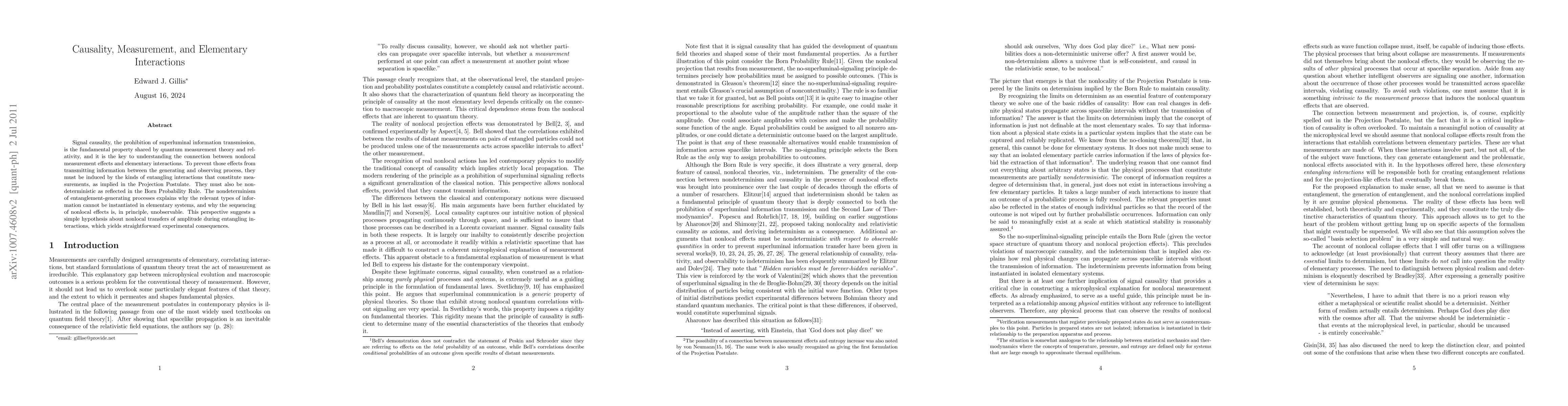 Signal causality, the prohibition of superluminal information transmission, is the fundamental property shared by quantum measurement theory and relativity, and it is the key to understanding the connection between nonlocal measurement effects and elementary interactions. To prevent those effects from transmitting information between the generating and observing process, they must be induced by the kinds of entangling interactions that constitute measurements, as implied in the Projection Postulate. They must also be nondeterministic as reflected in the Born Probability Rule. The nondeterminism of entanglement-generating processes explains why the relevant types of information cannot be instantiated in elementary systems, and why the sequencing of nonlocal effects is, in principle, unobservable. This perspective suggests a simple hypothesis about nonlocal transfers of amplitude during entangling interactions, which yields straightforward experimental consequences.