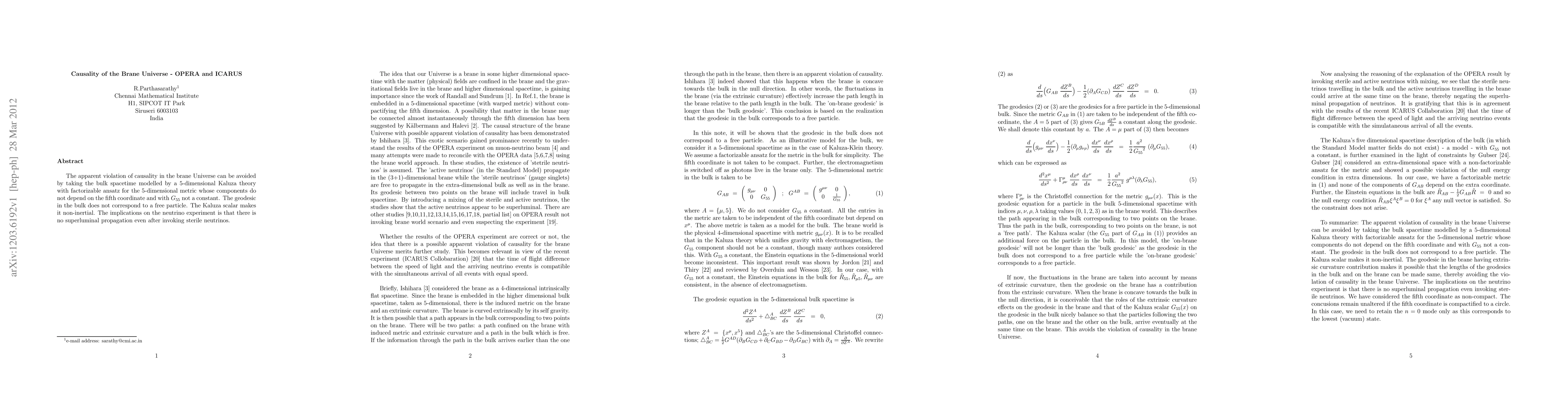 The apparent violation of causality in the brane Universe can be avoided by taking the bulk spacetime modelled by a 5-dimensional Kaluza theory with factorizable ansatz for the 5-dimensional metric whose components do not depend on the fifth coordinate and with $G_{55}$ not a constant. The geodesic in the bulk does not correspond to a free particle. The Kaluza scalar makes it non-inertial. The implication on the neutrino experiment is that there is no superluminal propagation even after invoking sterile neutrinos.
