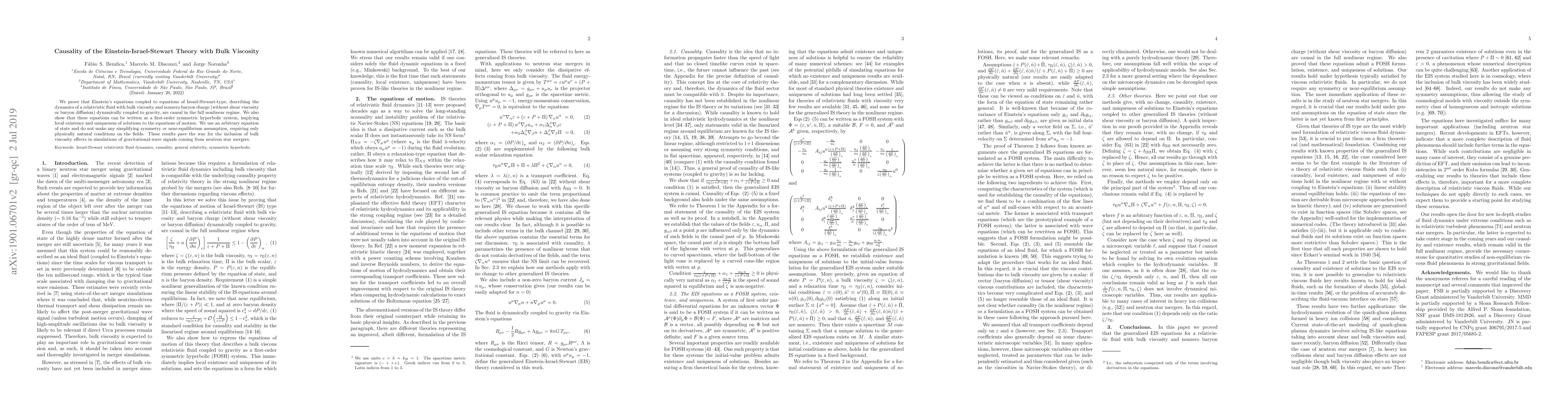 This paper demonstrates that Einstein's equations coupled with Israel-Stewart-type equations for relativistic fluids with bulk viscosity are causal in the nonlinear regime. The equations are shown to form a first-order symmetric hyperbolic system, ensuring local existence and uniqueness of solutions, which is crucial for simulating gravitational-wave signals from neutron star mergers.