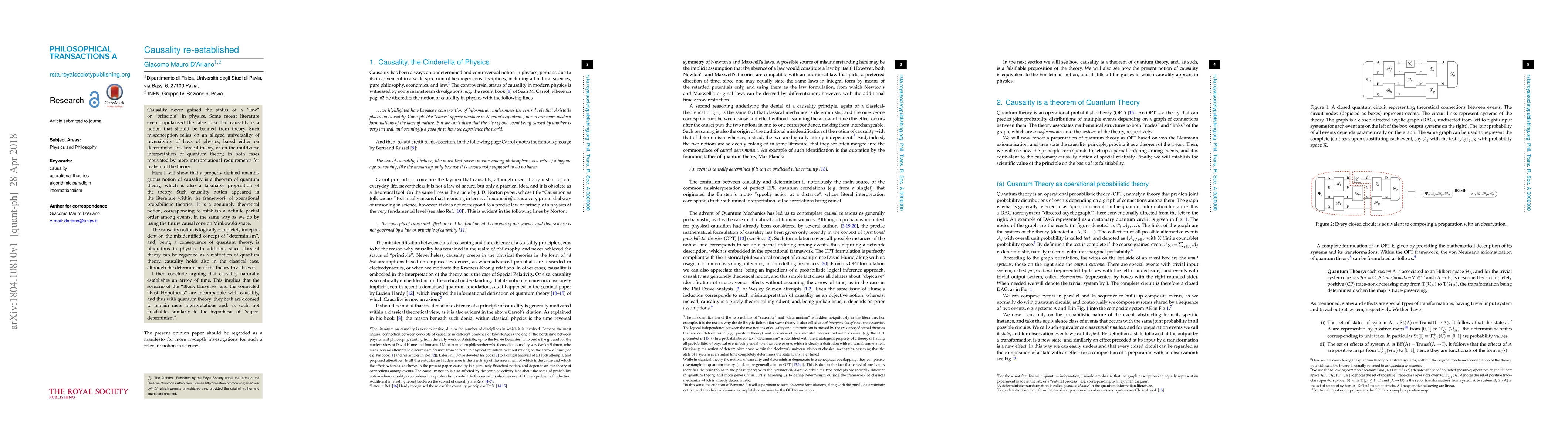 Causality never gained the status of a "law" or "principle" in physics. Some recent literature even popularized the false idea that causality is a notion that should be banned from theory. Such misconception relies on an alleged universality of reversibility of laws of physics, based either on determinism of classical theory, or on the multiverse interpretation of quantum theory, in both cases motivated by mere interpretational requirements for realism of the theory. Here, I will show that a properly defined unambiguous notion of causality is a theorem of quantum theory, which is also a falsifiable proposition of the theory. Such causality notion appeared in the literature within the framework of operational probabilistic theories. It is a genuinely theoretical notion, corresponding to establish a definite partial order among events, in the same way as we do by using the future causal cone on Minkowski space. The causality notion is logically completely independent of the misidentified concept of "determinism", and, being a consequence of quantum theory, is ubiquitous in physics. In addition, as classical theory can be regarded as a restriction of quantum theory, causality holds also in the classical case, although the determinism of the theory trivializes it. I then conclude arguing that causality naturally establishes an arrow of time. This implies that the scenario of the "Block Universe" and the connected "Past Hypothesis" are incompatible with causality, and thus with quantum theory: they both are doomed to remain mere interpretations and, as such, not falsifiable, similar to the hypothesis of "super-determinism". This article is part of a discussion meeting issue "Foundations of quantum mechanics and their impact on contemporary society".