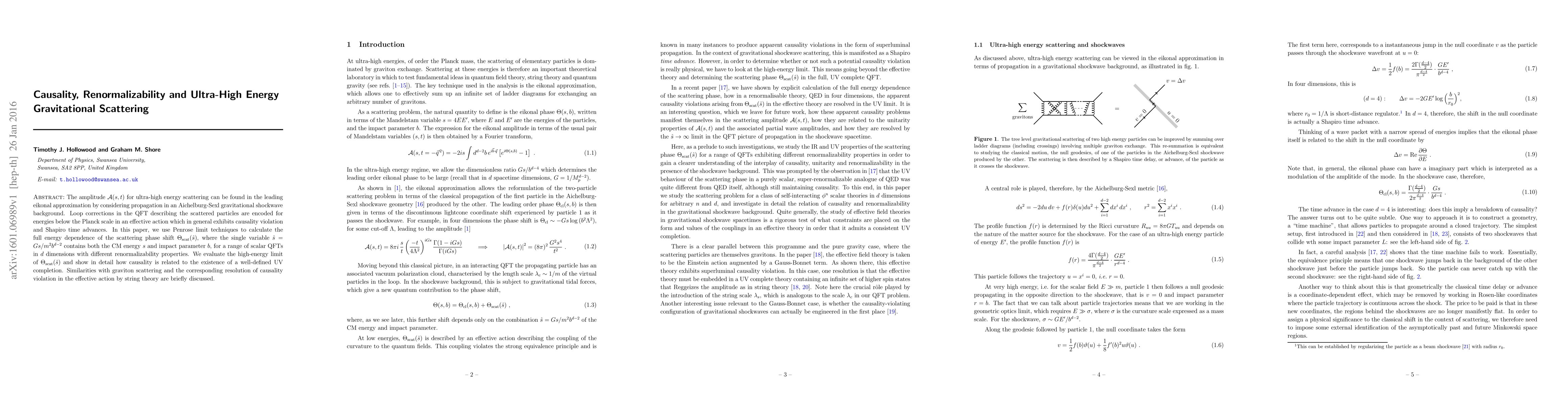 The amplitude A(s,t) for ultra-high energy scattering can be found in the leading eikonal approximation by considering propagation in an Aichelburg-Sexl gravitational shockwave background. Loop corrections in the QFT describing the scattered particles are encoded for energies below the Planck scale in an effective action which in general exhibits causality violation and Shapiro time advances. In this paper, we use Penrose limit techniques to calculate the full energy dependence of the scattering phase shift Theta_scat(hat_s},, where the single variable hat_s = Gs/m^2 b^(d-2) contains both the CM energy s and impact parameter b, for a range of scalar QFTs in d dimensions with different renormalizability properties. We evaluate the high-energy limit of Theta_scat(hat_s) and show in detail how causality is related to the existence of a well-defined UV completion. Similarities with graviton scattering and the corresponding resolution of causality violation in the effective action by string theory are briefly discussed.