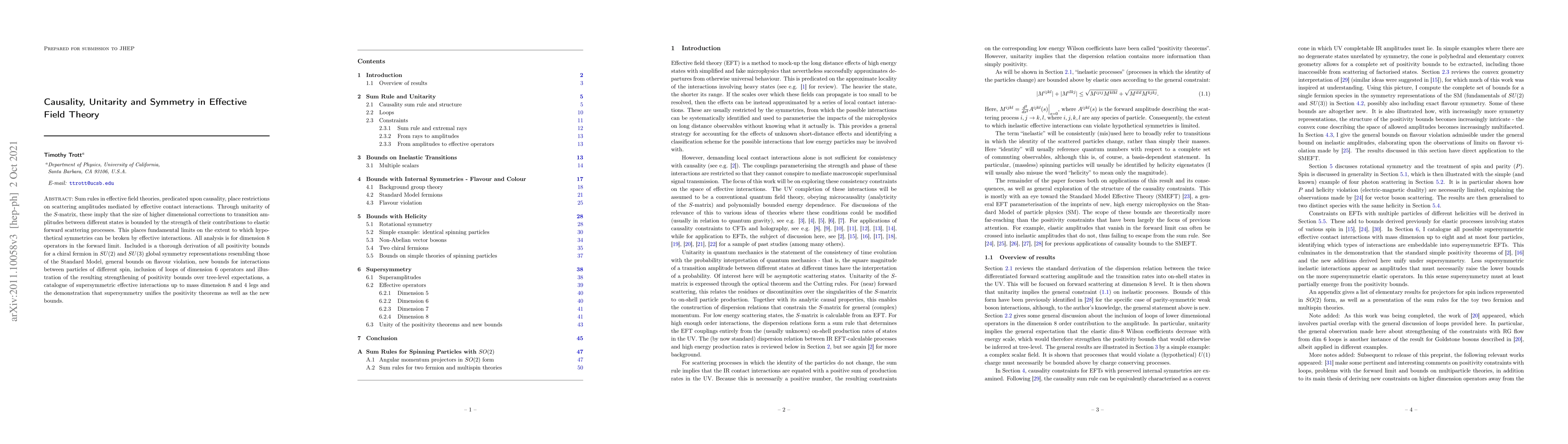 Sum rules in effective field theories, predicated upon causality, place restrictions on scattering amplitudes mediated by effective contact interactions. Through unitarity of the $S$-matrix, these imply that the size of higher dimensional corrections to transition amplitudes between different states is bounded by the strength of their contributions to elastic forward scattering processes. This places fundamental limits on the extent to which hypothetical symmetries can be broken by effective interactions. All analysis is for dimension $8$ operators in the forward limit. Included is a thorough derivation of all positivity bounds for a chiral fermion in $SU(2)$ and $SU(3)$ global symmetry representations resembling those of the Standard Model, general bounds on flavour violation, new bounds for interactions between particles of different spin, inclusion of loops of dimension $6$ operators and illustration of the resulting strengthening of positivity bounds over tree-level expectations, a catalogue of supersymmetric effective interactions up to mass dimension $8$ and $4$ legs and the demonstration that supersymmetry unifies the positivity theorems as well as the new bounds.