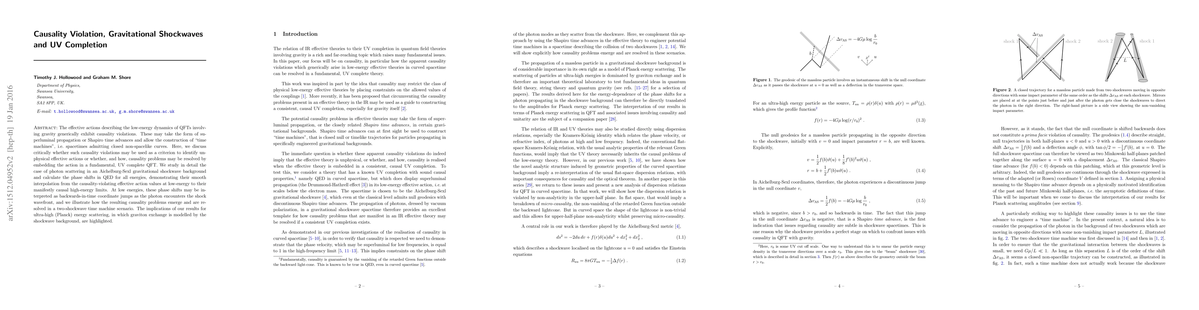 The paper presents detailed calculations of the refractive index and phase shift for photon scattering from gravitational shockwaves in QED and a scalar field theory, demonstrating the restoration of causality in the high-frequency limit within a UV-complete framework.