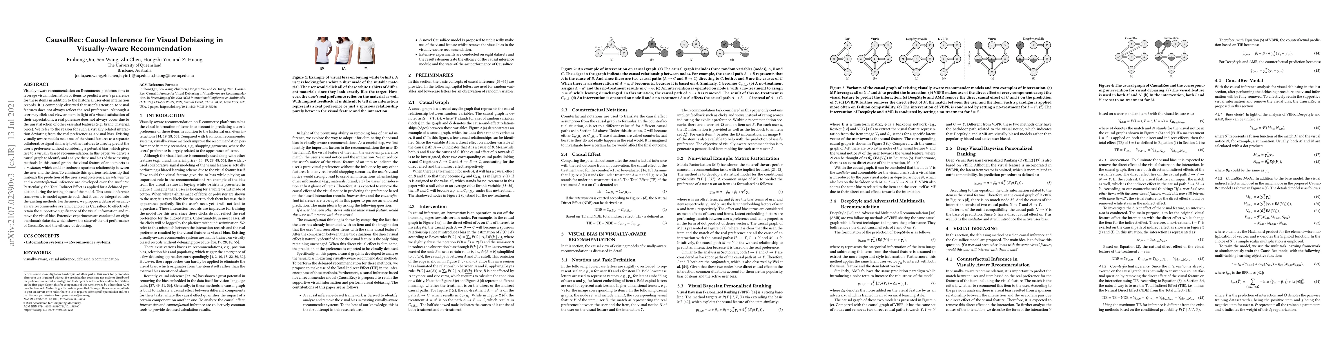CausalRec proposes a causal inference framework to identify and mitigate visual bias in visually-aware recommendation systems, ensuring predictions reflect users' true preferences rather than just visual satisfaction. The method employs causal graphs and counterfactual inference to debias recommendations, achieving state-of-the-art performance on benchmark datasets.