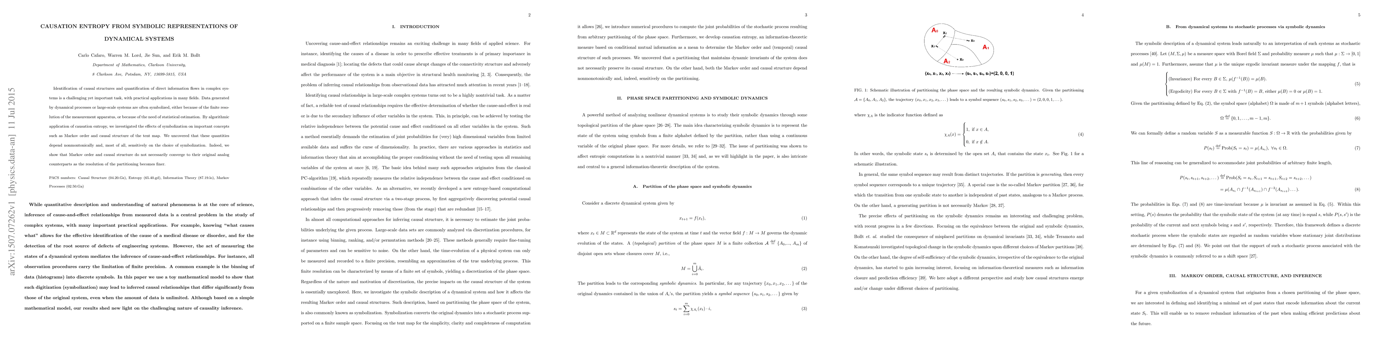 Identification of causal structures and quantification of direct information flows in complex systems is a challenging yet important task, with practical applications in many fields. Data generated by dynamical processes or large-scale systems are often symbolized, either because of the finite resolution of the measurement apparatus, or because of the need of statistical estimation. By algorithmic application of causation entropy, we investigated the effects of symbolization on important concepts such as Markov order and causal structure of the tent map. We uncovered that these quantities depend nonmontonically and, most of all, sensitively on the choice of symbolization. Indeed, we show that Markov order and causal structure do not necessarily converge to their original analog counterparts as the resolution of the partitioning becomes finer.