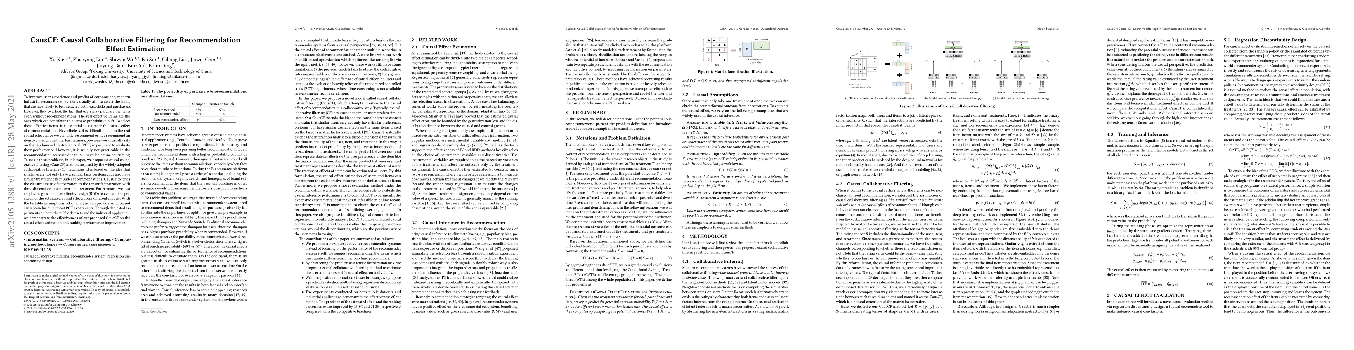 The paper proposes CausCF, a causal collaborative filtering method to improve recommendation systems by estimating the causal effect of recommendations on purchase probability uplift. It extends matrix factorization to tensor factorization and employs regression discontinuity design to evaluate causal effects without requiring randomized controlled trials.