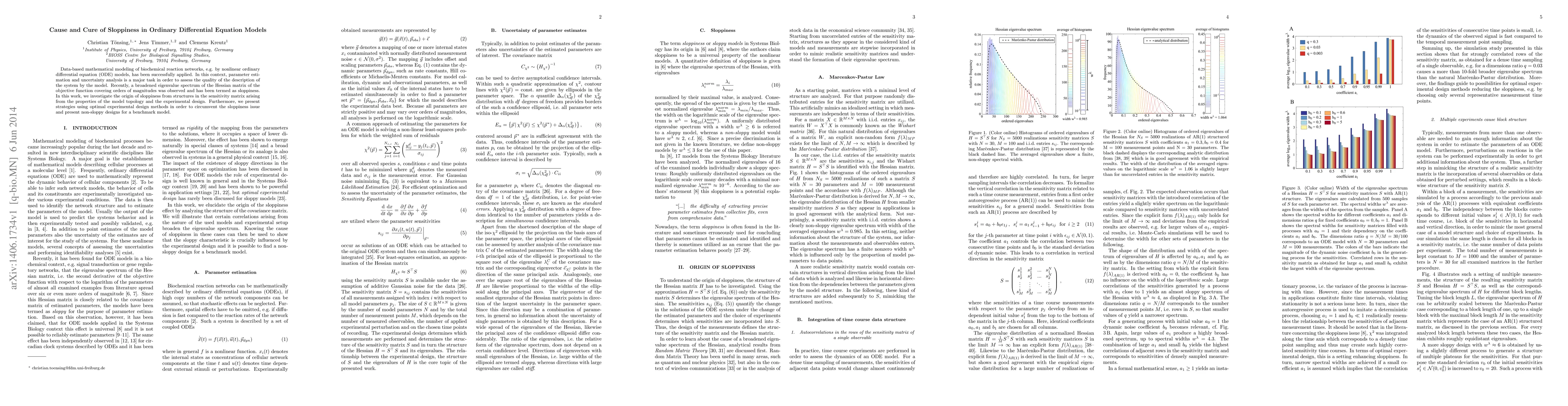 Data-based mathematical modeling of biochemical reaction networks, e.g. by nonlinear ordinary differential equation (ODE) models, has been successfully applied. In this context, parameter estimation and uncertainty analysis is a major task in order to assess the quality of the description of the system by the model. Recently, a broadened eigenvalue spectrum of the Hessian matrix of the objective function covering orders of magnitudes was observed and has been termed as sloppiness. In this work, we investigate the origin of sloppiness from structures in the sensitivity matrix arising from the properties of the model topology and the experimental design. Furthermore, we present strategies using optimal experimental design methods in order to circumvent the sloppiness issue and present non-sloppy designs for a benchmark model.